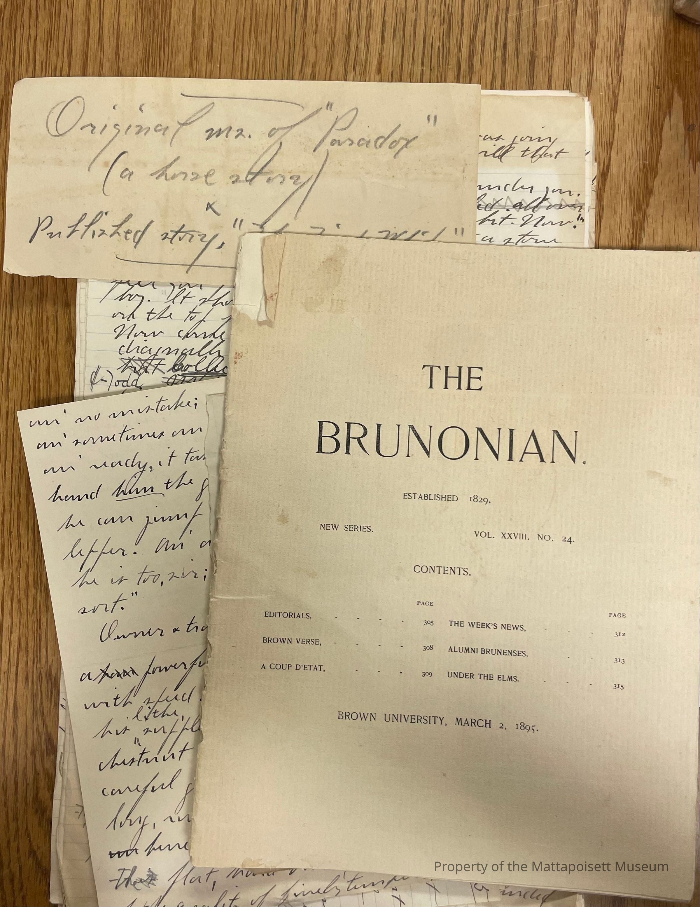 A stack of handwritten manuscripts including a paper stating "Original ms. of 'Paradox' (a horse story), Published story, 'The First Whip.'" A copy of "The Brunonian" magazine/newspaper with Harrington's story "A Coup D'etat" inside, edited and signed by Harrington.Context