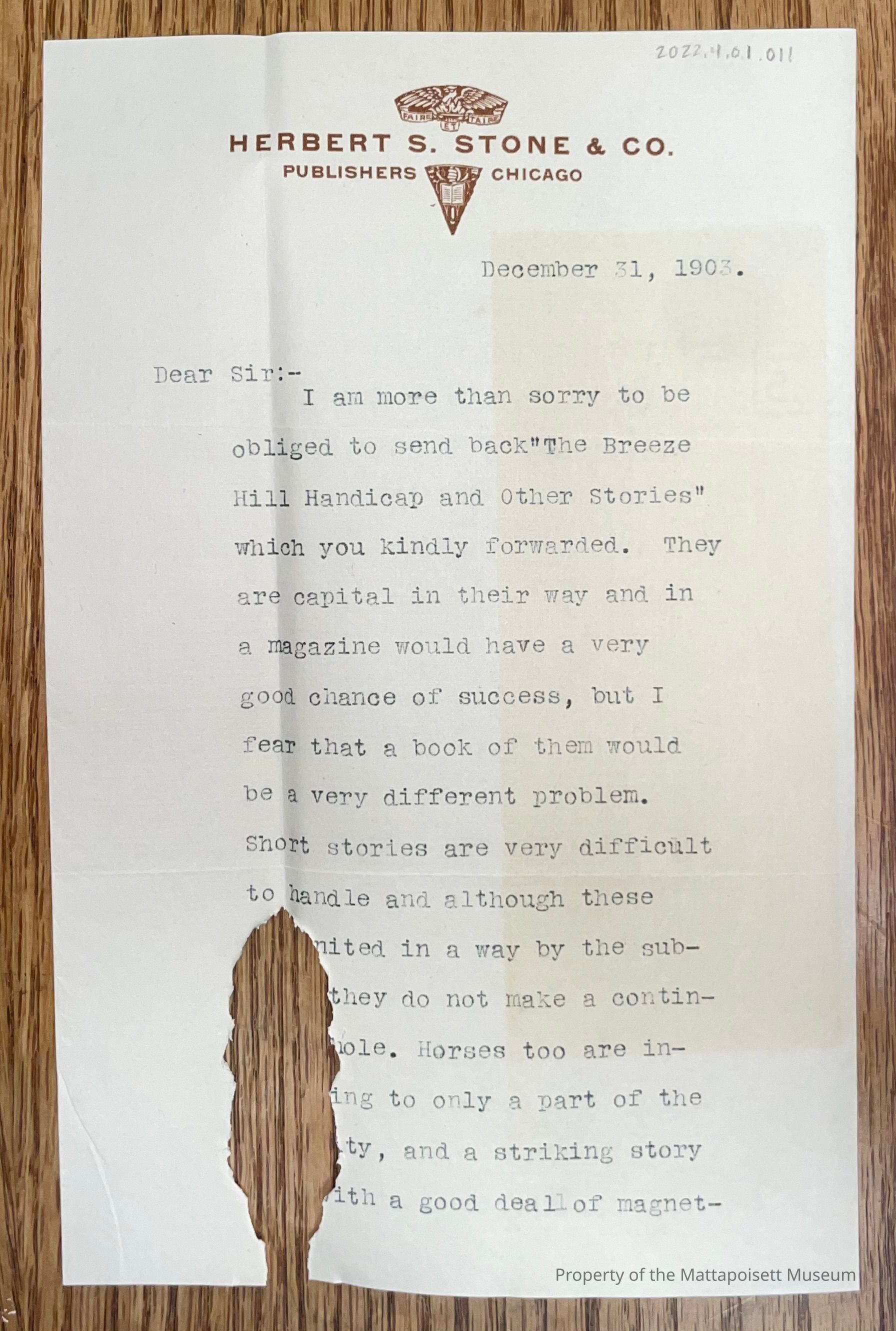 A rejection letter of Harrington's short story collection titled "The Breeze Hill Handicap and Other Stories." The author of the letters suggests that the stories would do better in a magazine than in a book, as the writing is good but the topic of horses is too specific to sell.Subject Person/Organization