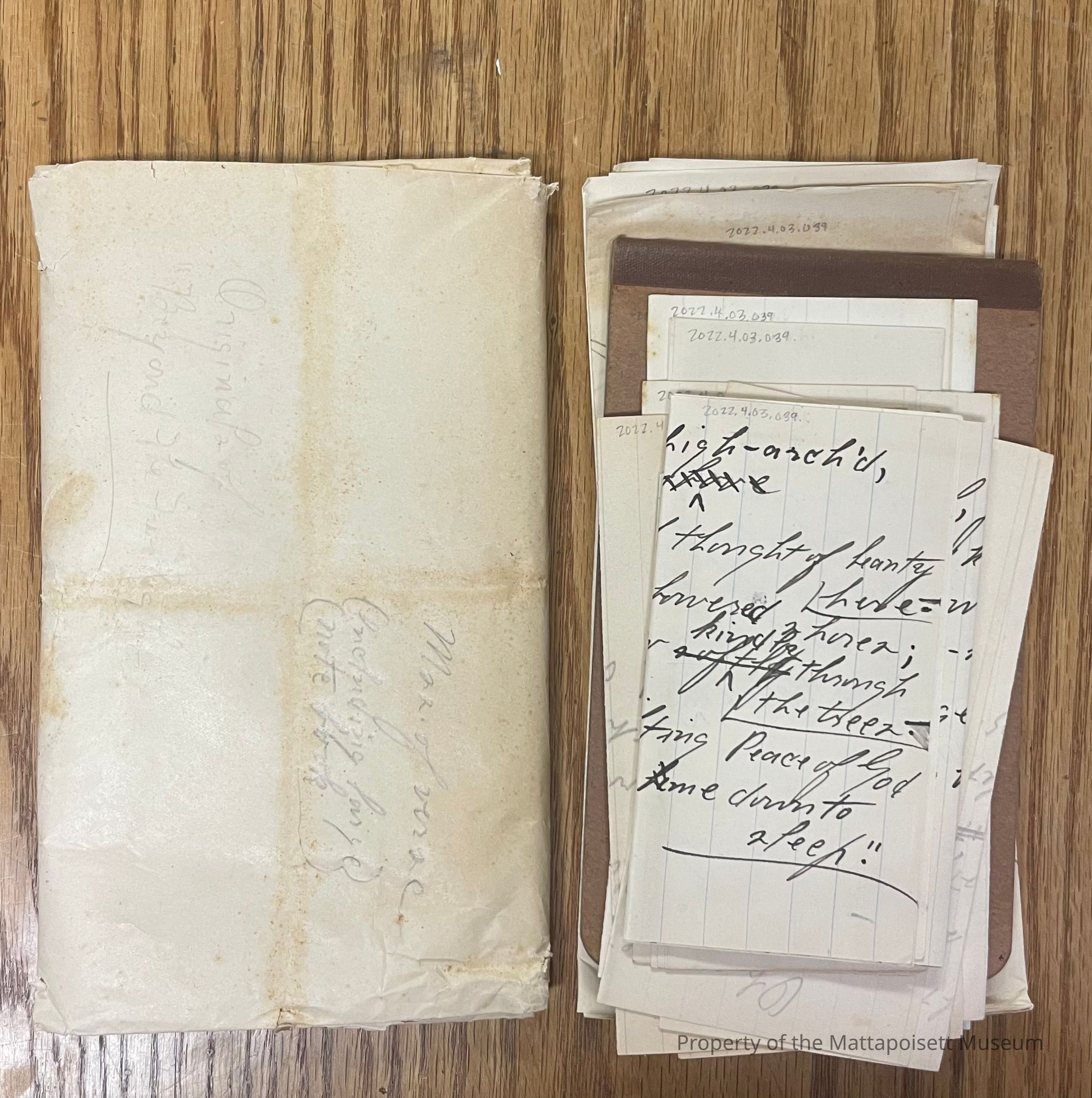 Everything in the collection (letters, manuscripts, typewriter, wedding dress, documents, books) was found in the attic of 18 Pine Island Road, Mattapoisett in 2022 and donated by the new house owners. This house was owned by Harrington and his wife. They subdivided the land and created Winnatuxett Beach Rd. George and Marian Harrington were the first couple ever married in St. Philips Church on Water Street. They were married in 1898.