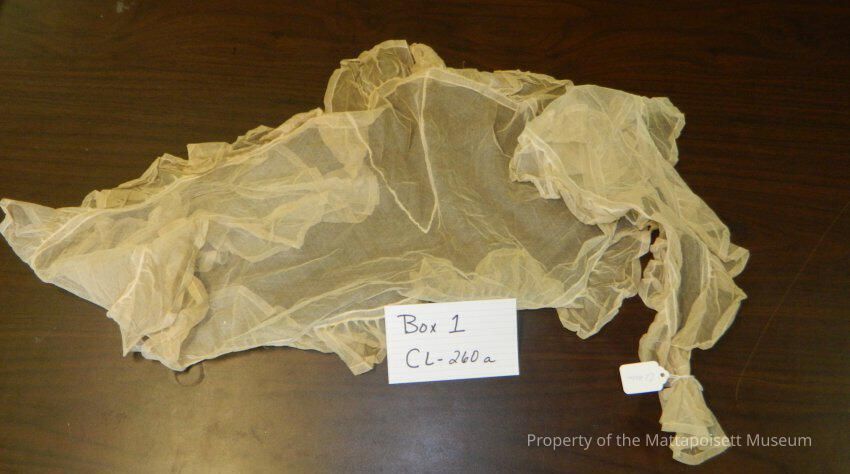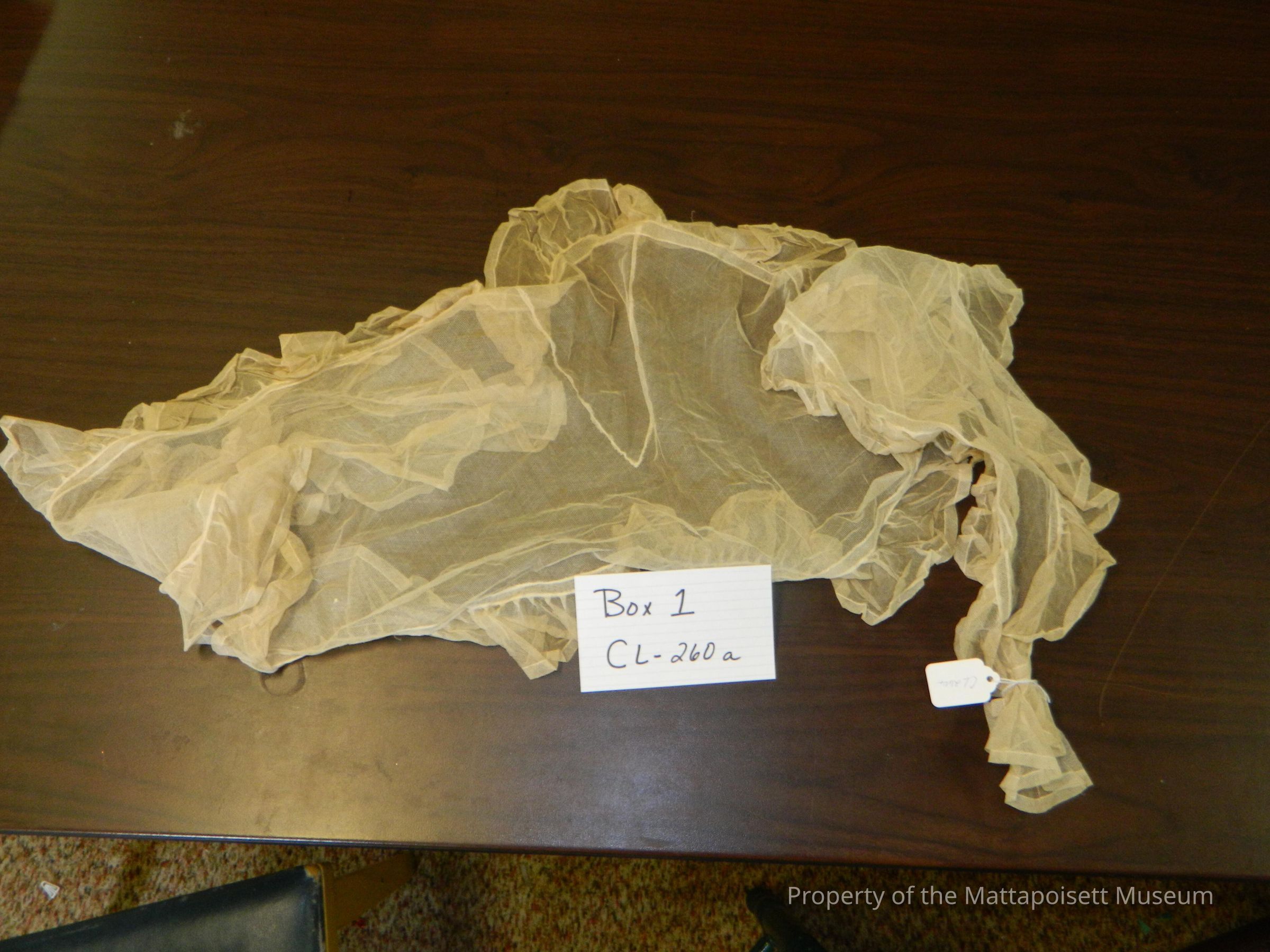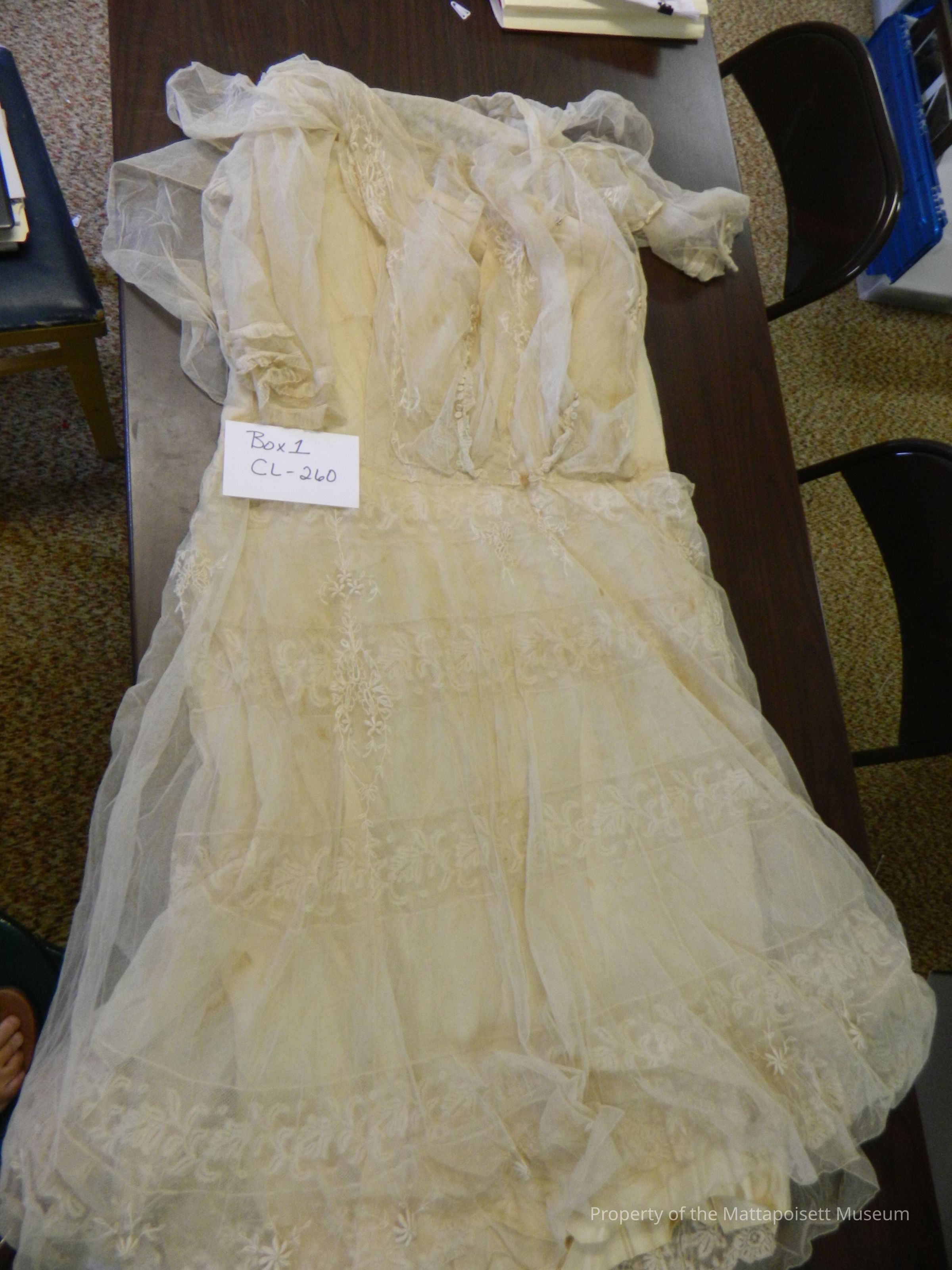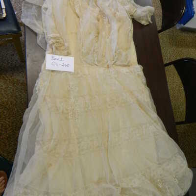 Wedding gown and shawl. Snapped closure on side of wedding dress made of two layers of organza tulle overlay with silk bodice with 3/4 sleeves double ruffle lace edge. Crewel work applied throughout. Net shawl with suffeled edge (260a). Small tear in bodice overlayAcquisition