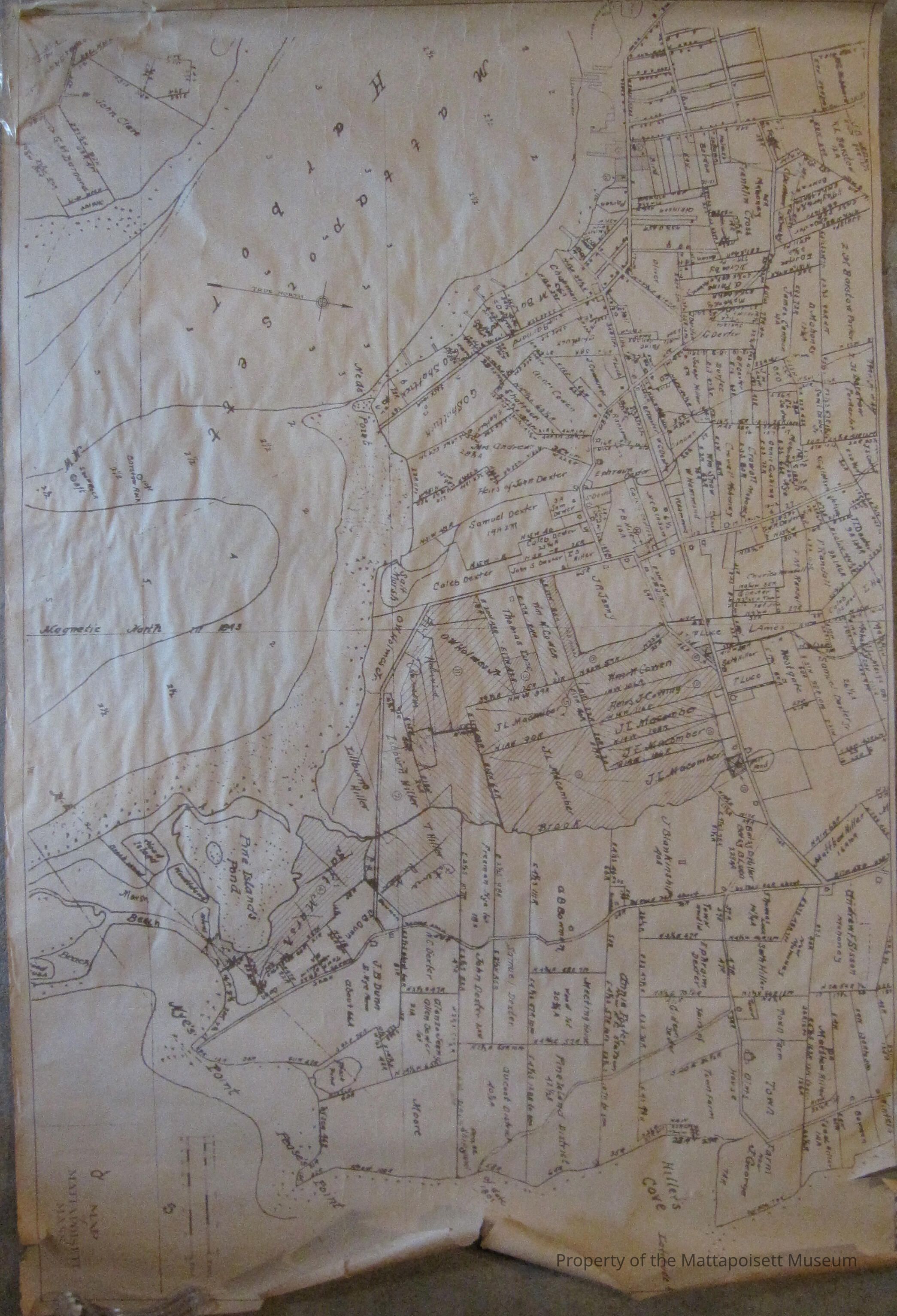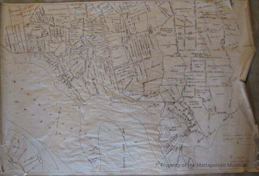 Early map of southern Mattapoisett/harbor. Property owners are marked.