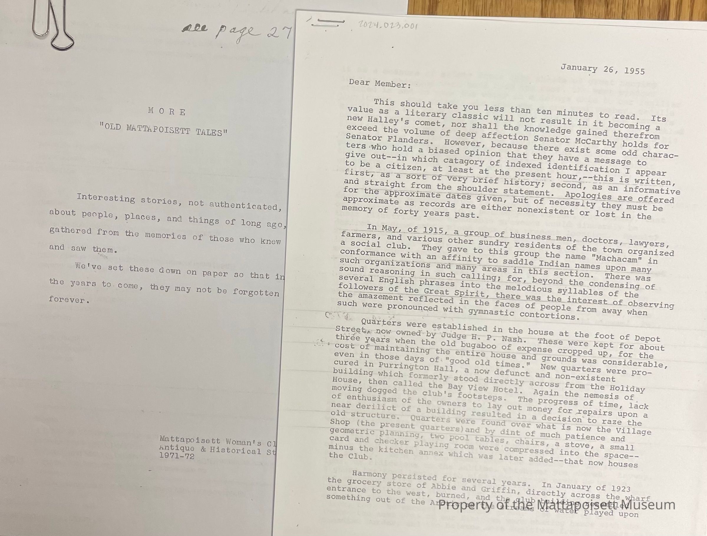 - A History of Machacam by the Mattapoisett Women's Club, 1972
