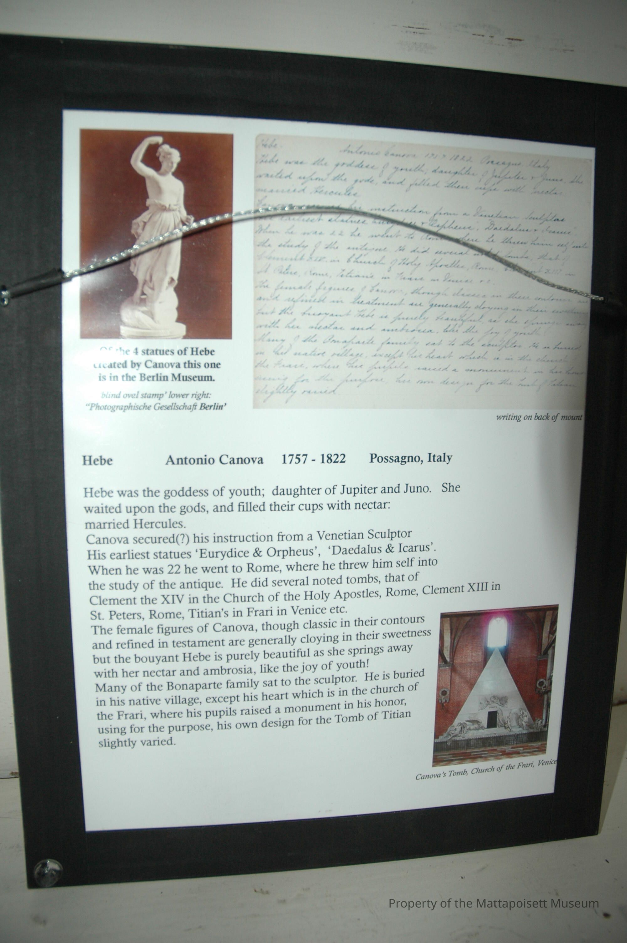 Black and white photgraph of "Hebe" statue created by Antonia Canova with information regarding history of the statue and the Greek goddess Hebe.Acquisition