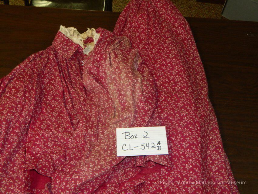2 piece deep red, tiny white pattern of white. High collar with white lace and gathered shoulders. Long sleeves. Skirt with one button, zipper and many gather in back. Two layers in back and pleated front.Collection