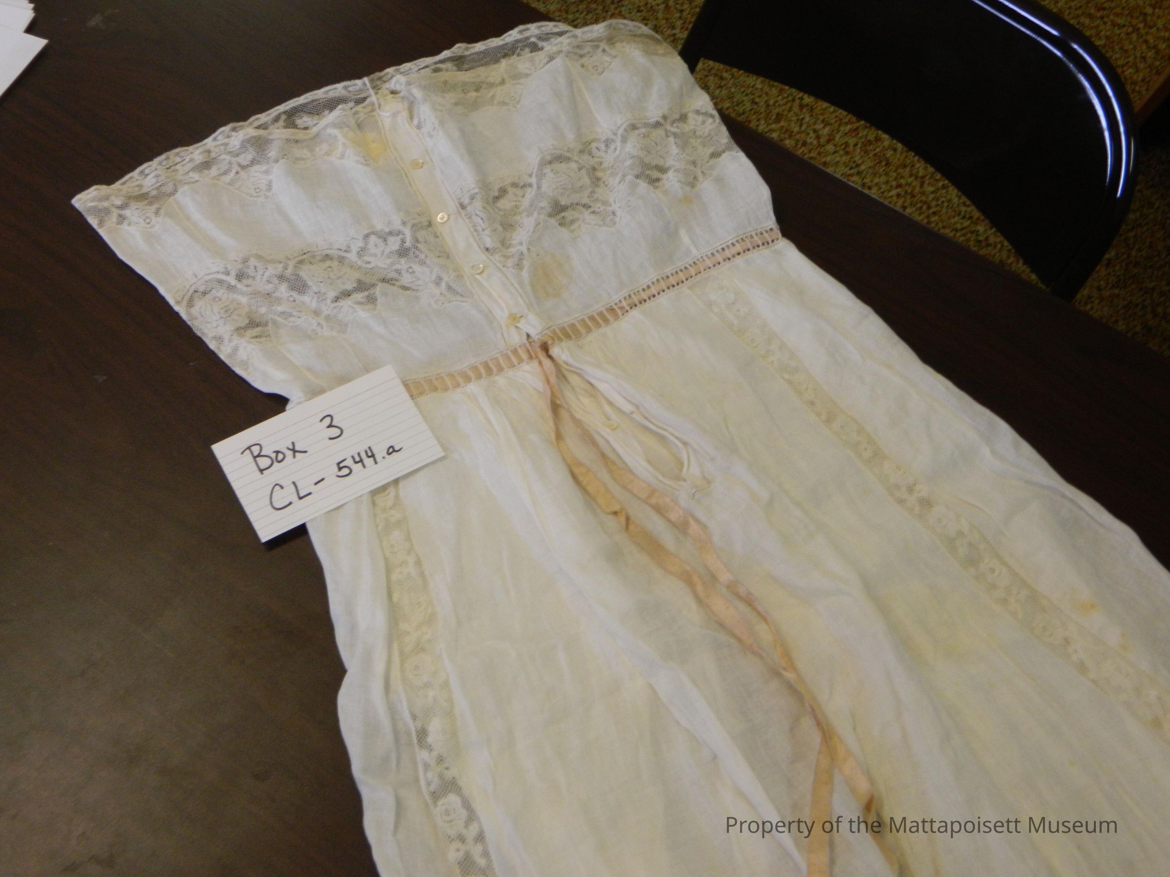 Notes: Notecard: Camisole with fillet lace and satin ribbon inset. Embroidered and lace.Created By