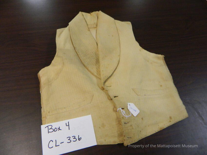 Notes: Notecard: Cotton lined, man's cotton vest. Pocket contains note "wedding vest of T. B. Denham when he married Rachael Gilbert beach at Easton, October 9, 1836"Created By
