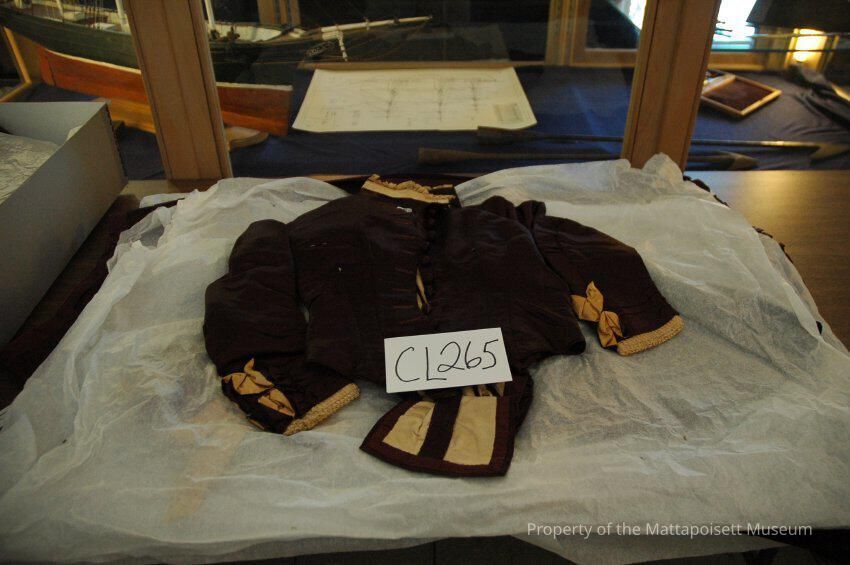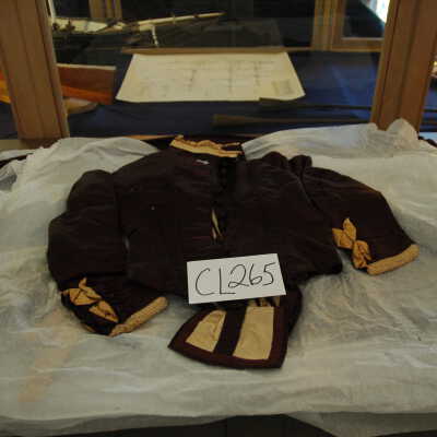 Helen Richmond-Peter Richmond's grandmother Sharp's wedding outfit 1880. Cape and bonnet with cream trim, maroon skirt and waistcoat.Collection