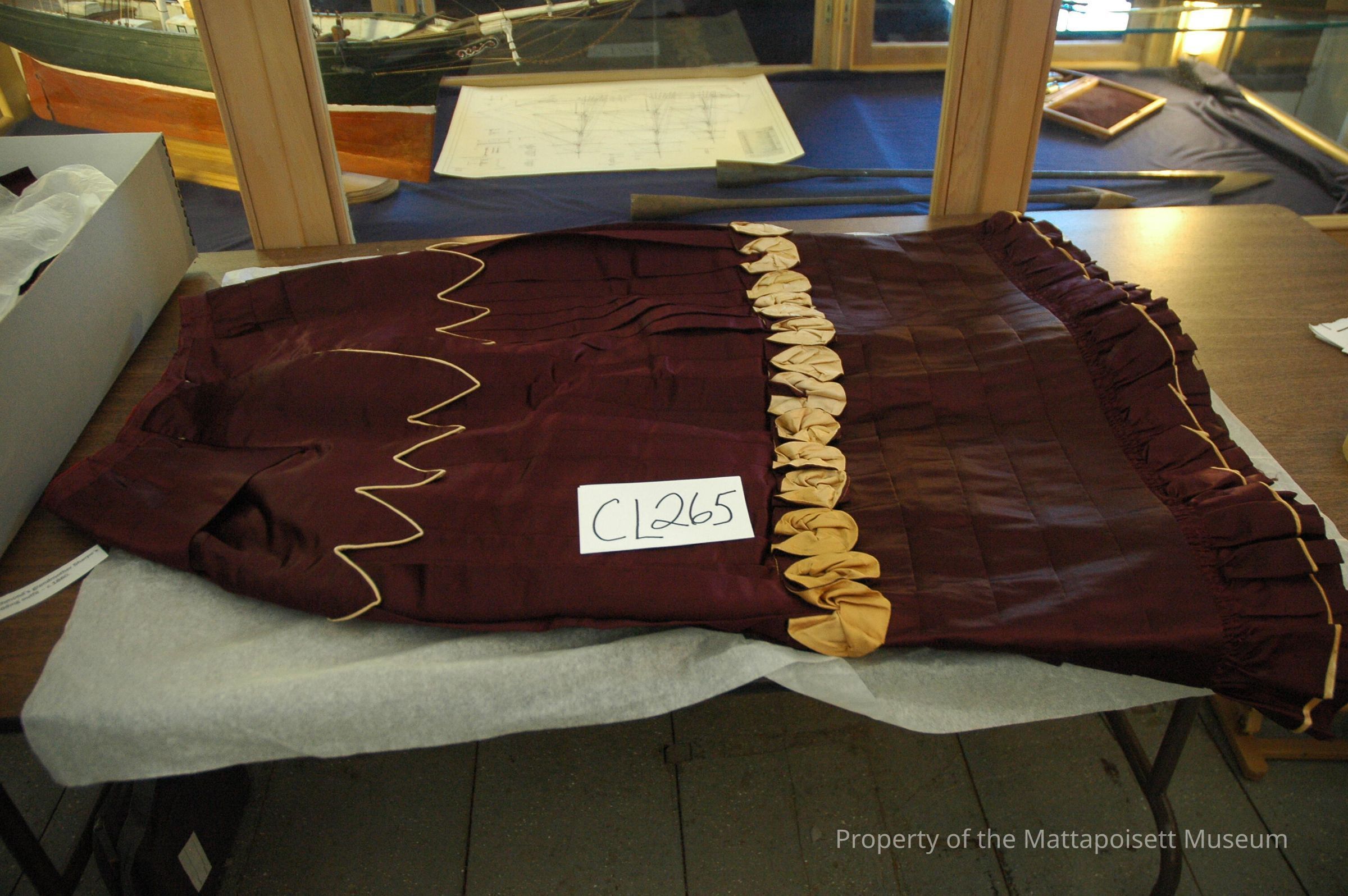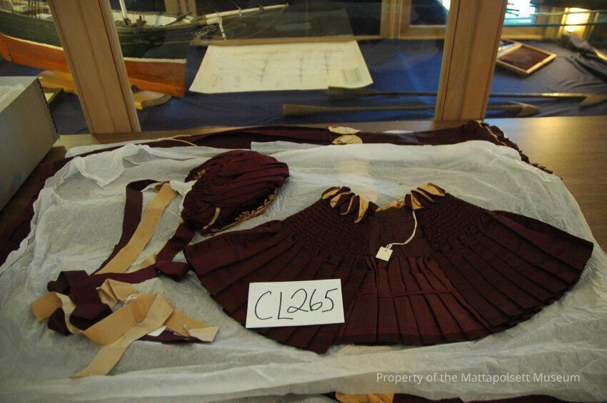 Notes: Notecard: Wedding dress with cape and bonnet. Maroon with cream trim. Helen Richmond's, (Peter Richmond's) Grandmother Sharpe wedding outfit.Created By