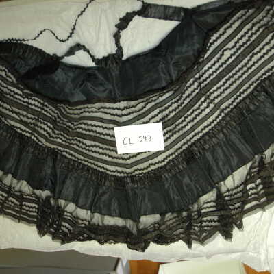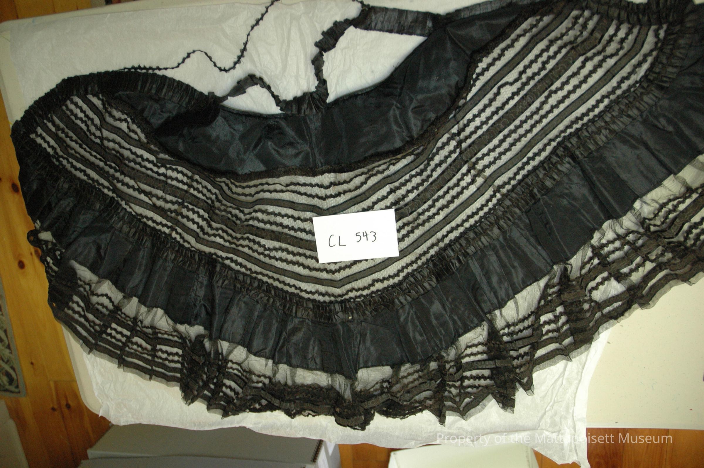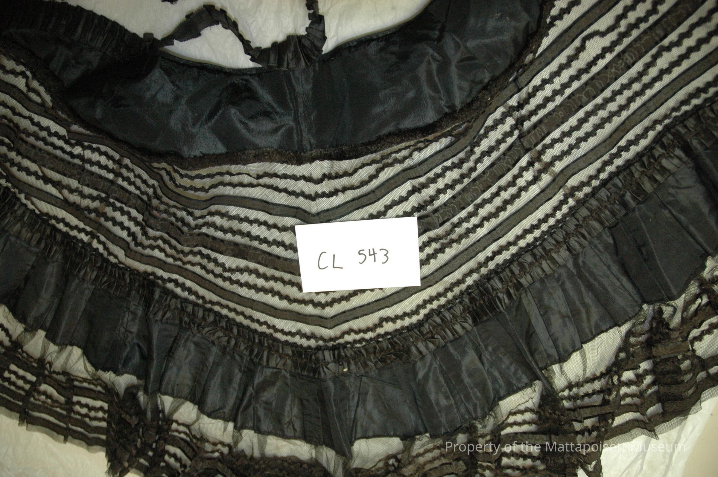 Notes: Notecard: Black silk taffeta cape, lace trim. Long front panels.Created By