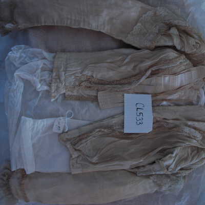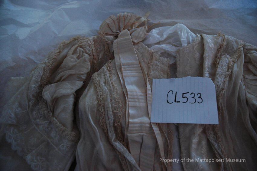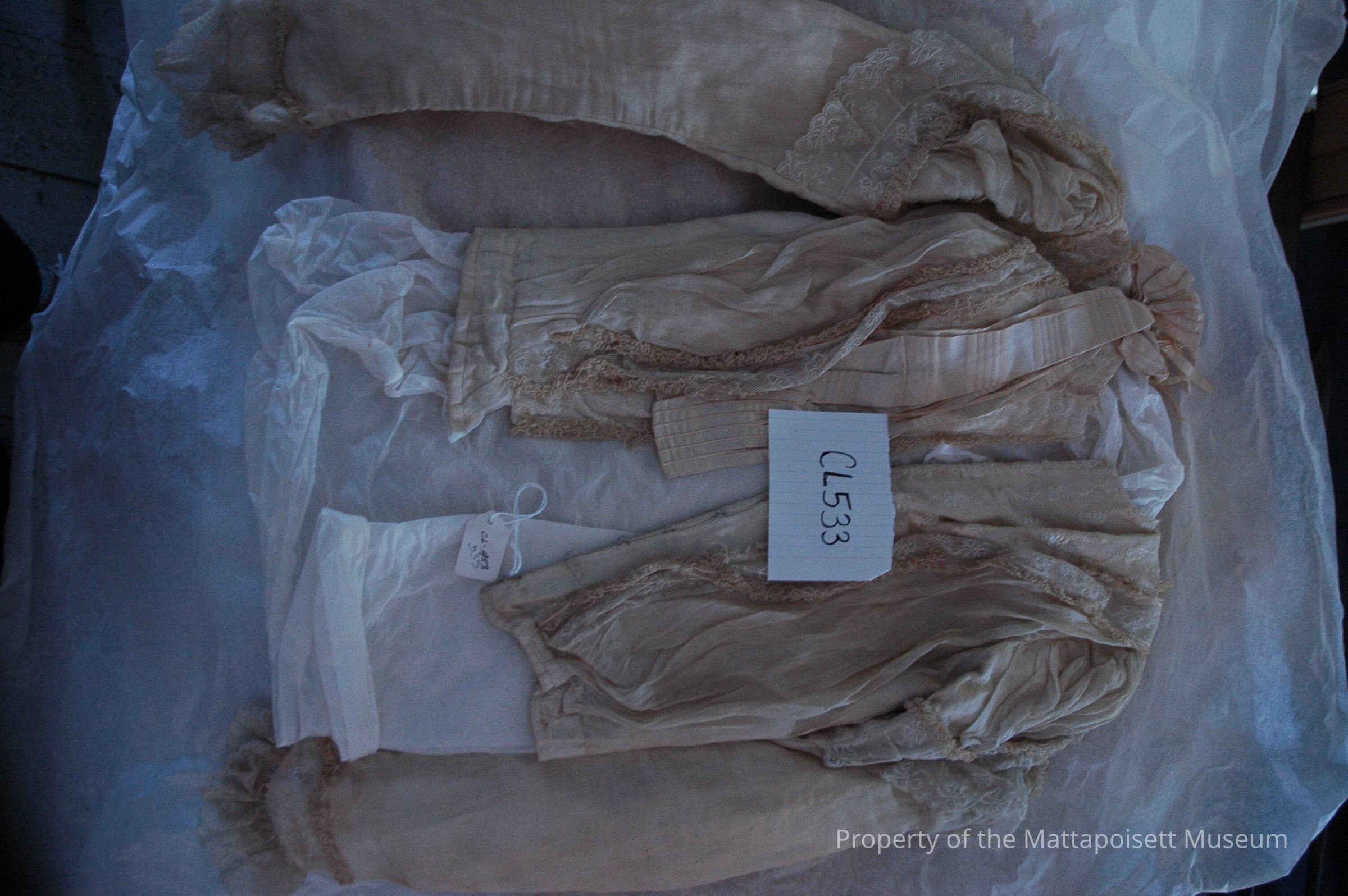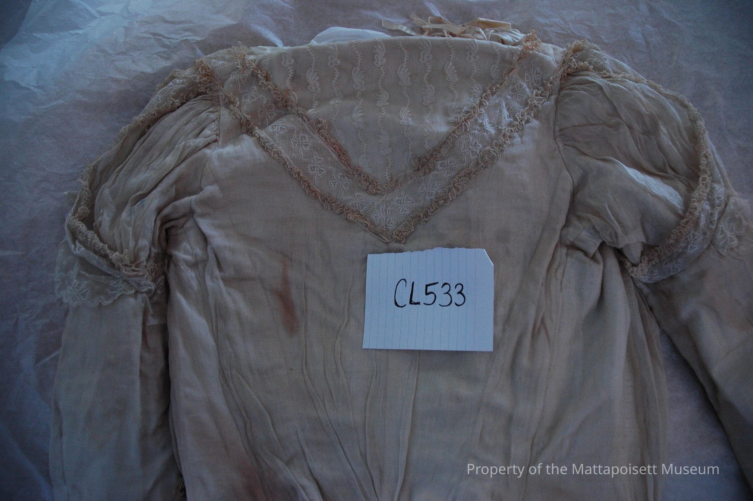 Notes: Notecard: Cream waist, fine net over cotton. Pleated bodice, lace trim at sleeves and bodice. Satin rosettes at neck.Created By