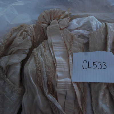 Cream waist, net over cotton. Lace trim, cream on cream embroidery at neckline. Striped cream on cream satin ribbon. Stays at waist and hook and eye fasterners. Satin rosette at neck.Collection