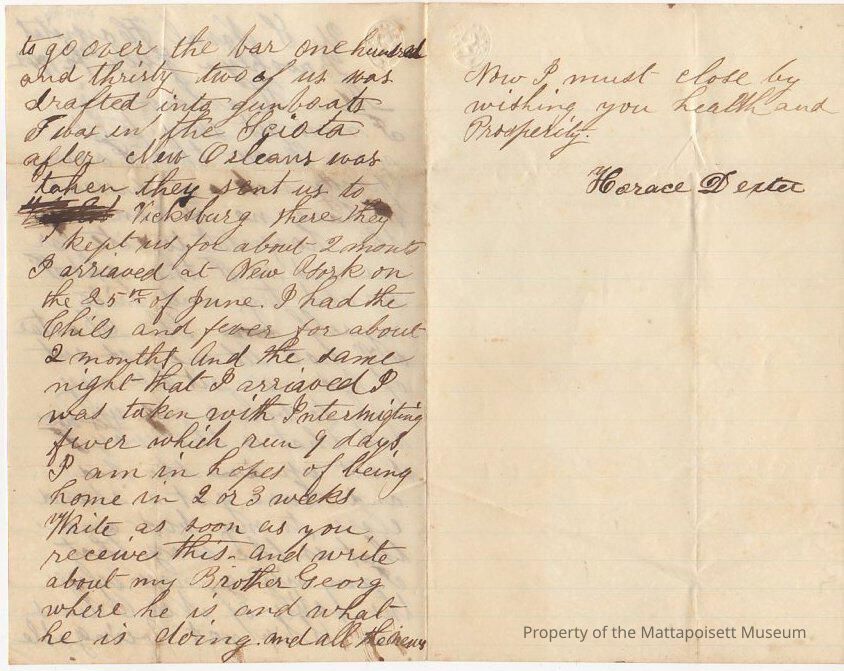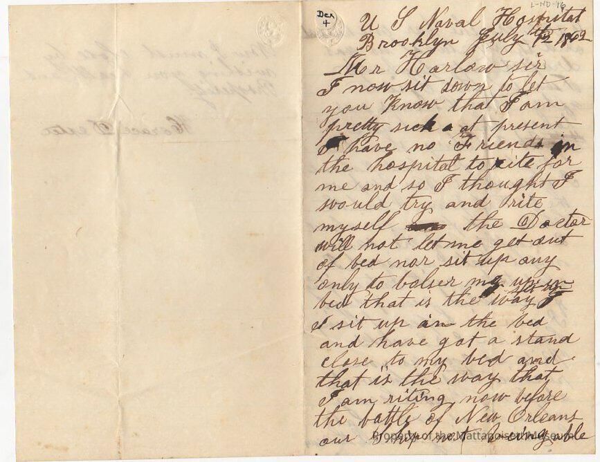 Letter to "Mr. Harlow" from Horace Dexter in US Naval Hospital in Brooklyn.Collection