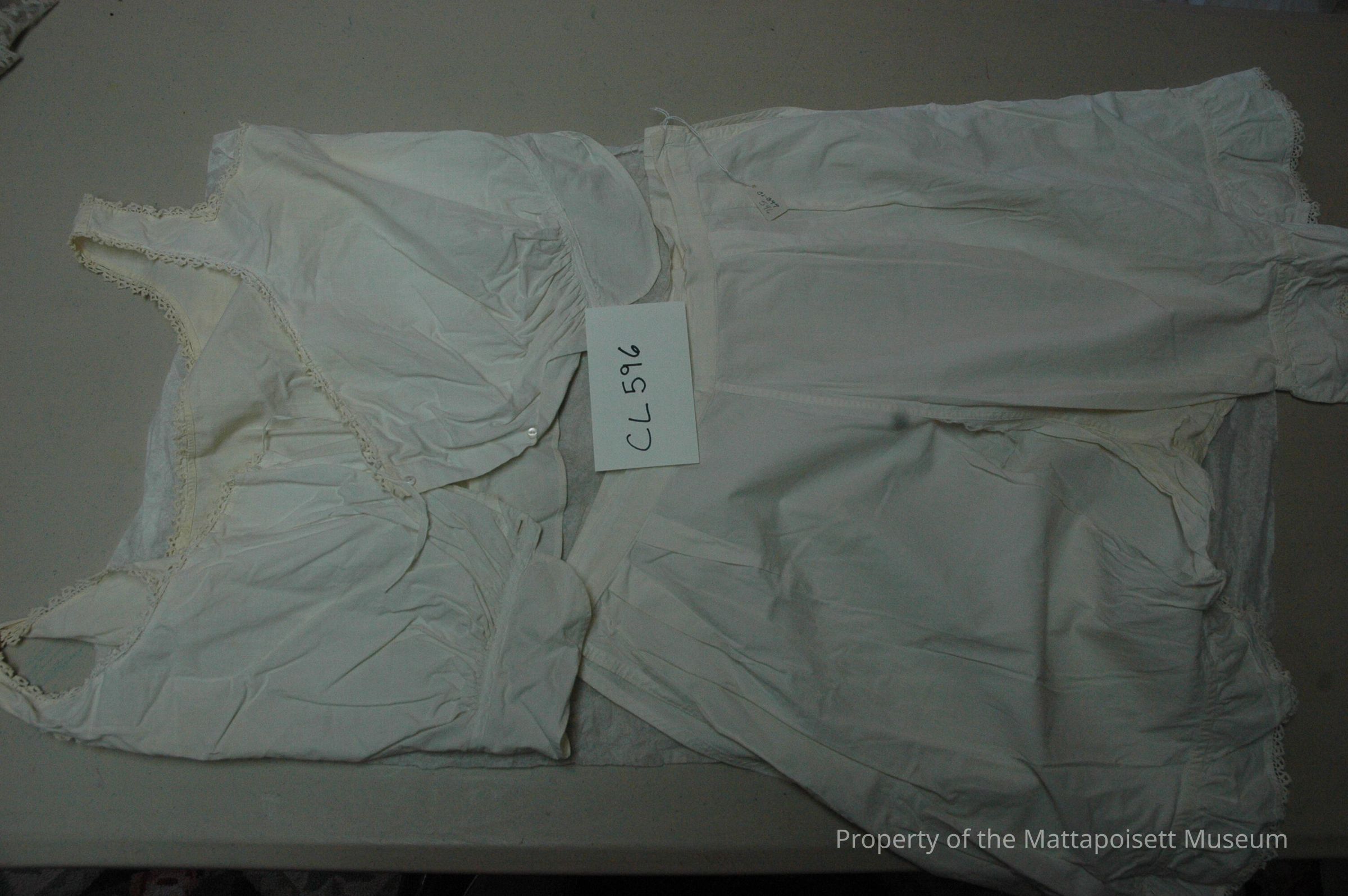 Notes: Notecard: Camisole and bloomers. Bloomers, knee length, white crocheted trim on bottom of bloomers and neck of camisole.Created By