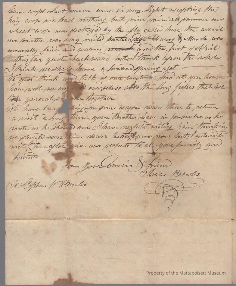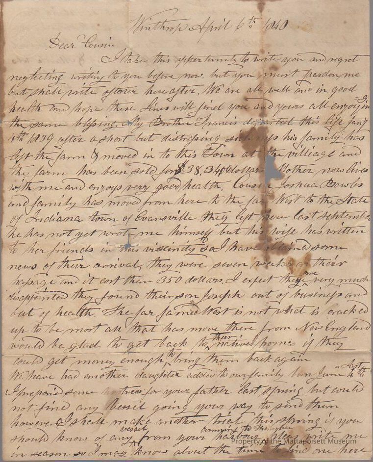 Letter to "Dear Cousin" (Stephen W. Bowles in Rochester/Mattapoisett) from "Your Cousin & friend" Isaac Bowles.Collection