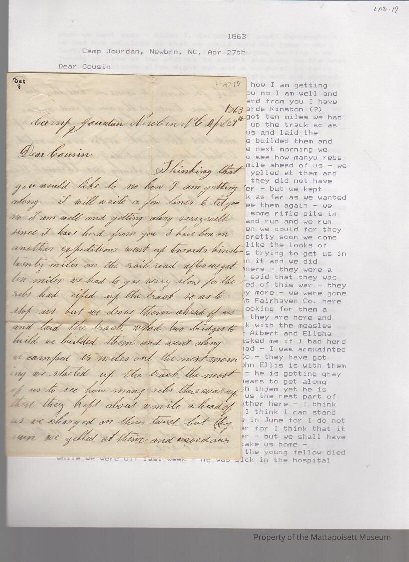 Letter to "Dear Cousin" from Andrew Dexter at Camp Jourdan, Newbrn, NC. Transcript.Collection