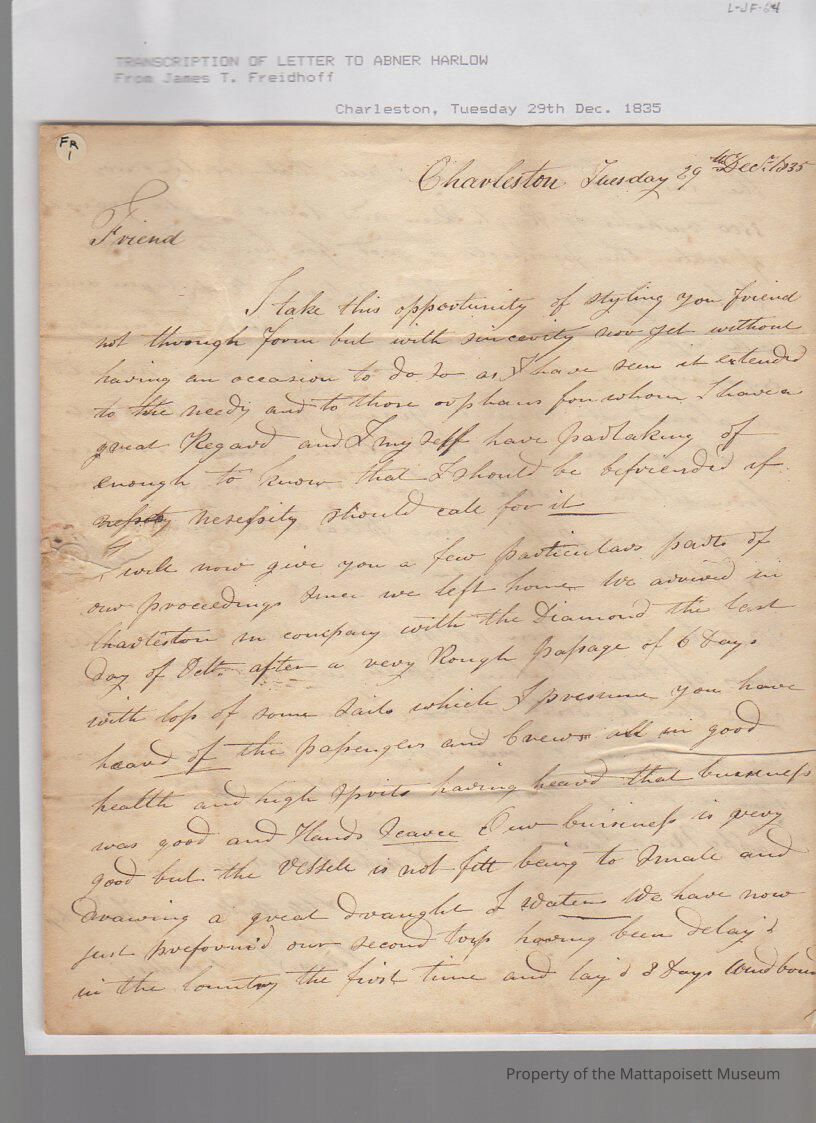 Letter to "Friend" (addressed to Abner Harlow) from James T. Freidhoff in CharlestonCollection