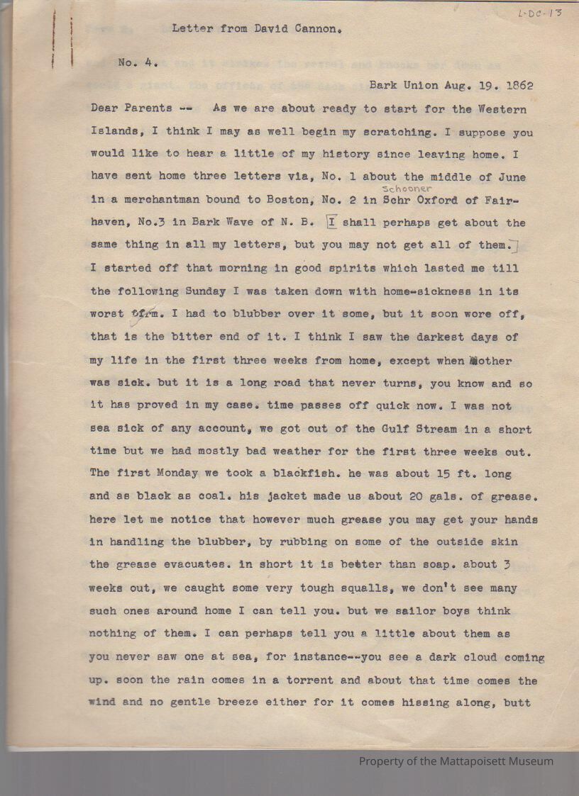 Transcription of letter from David Cannon to parents. Original not includedCollection