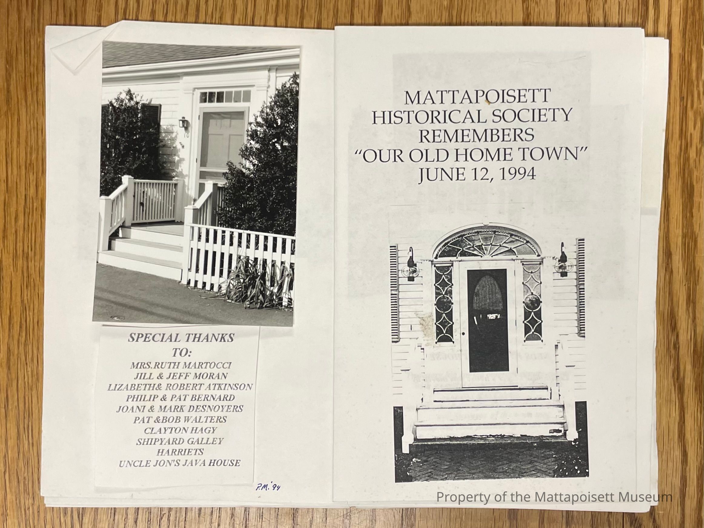 Mattapoisett Historical Society village tour booklet. Titled, "Remembers 'Our Old Home Town' June 12, 1994"Description