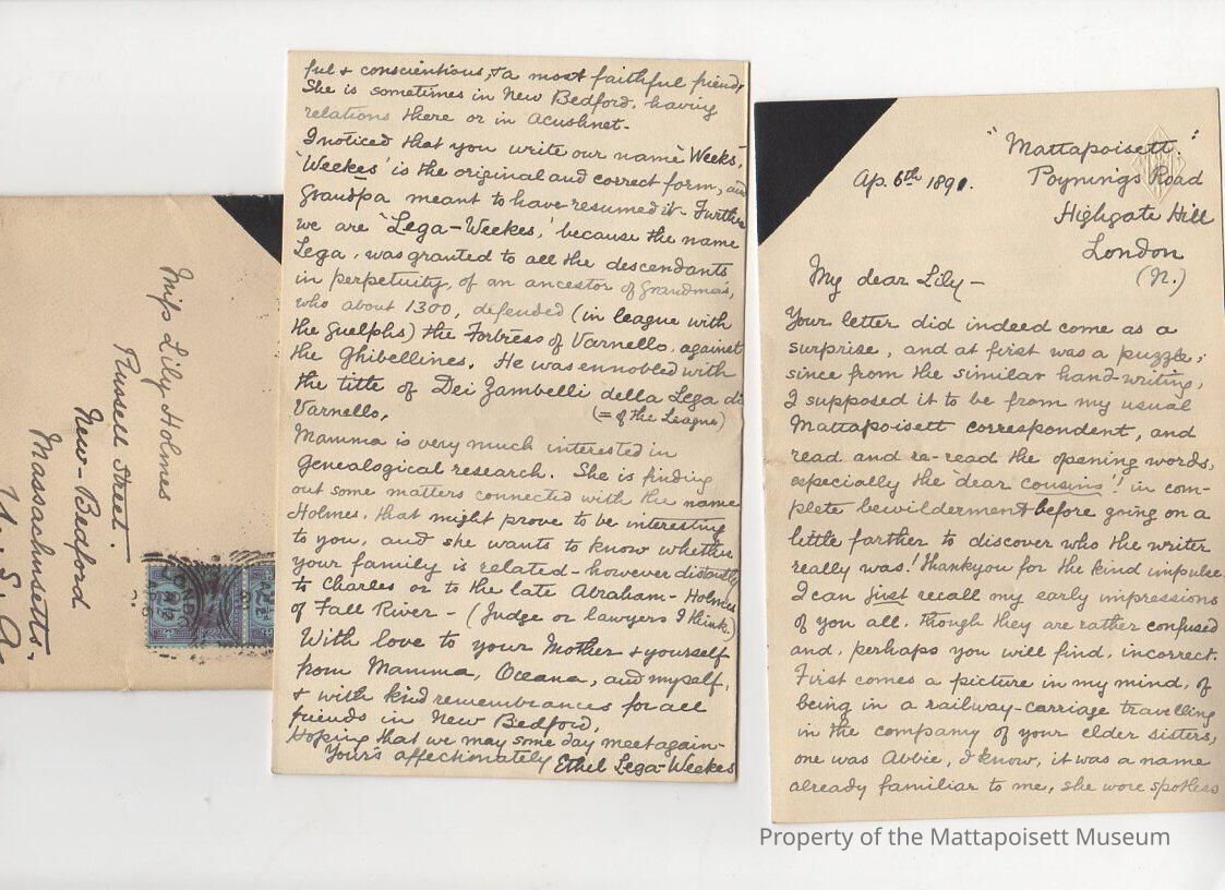 Letter to Lily Howland from Ethel Lega-Weekes. Explains background of last name.Collection