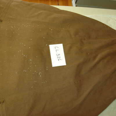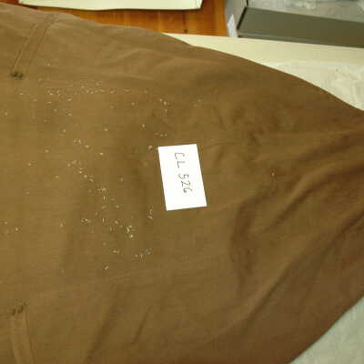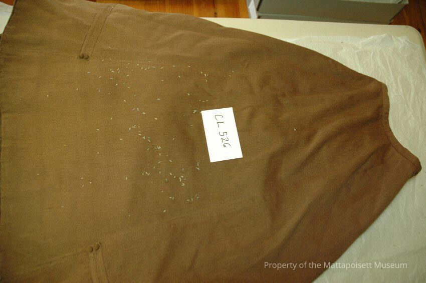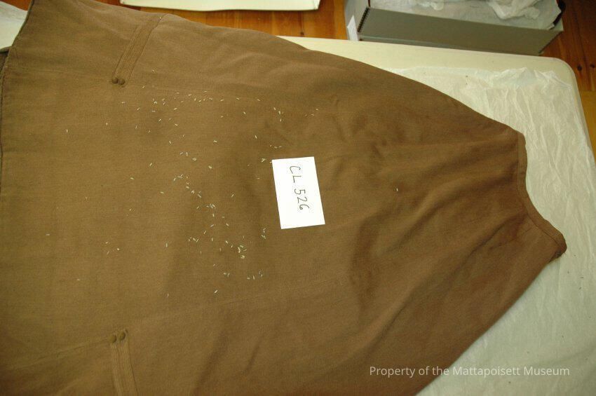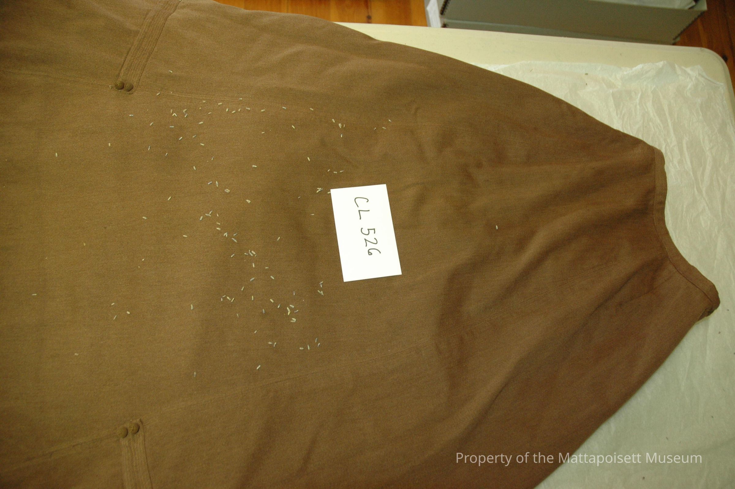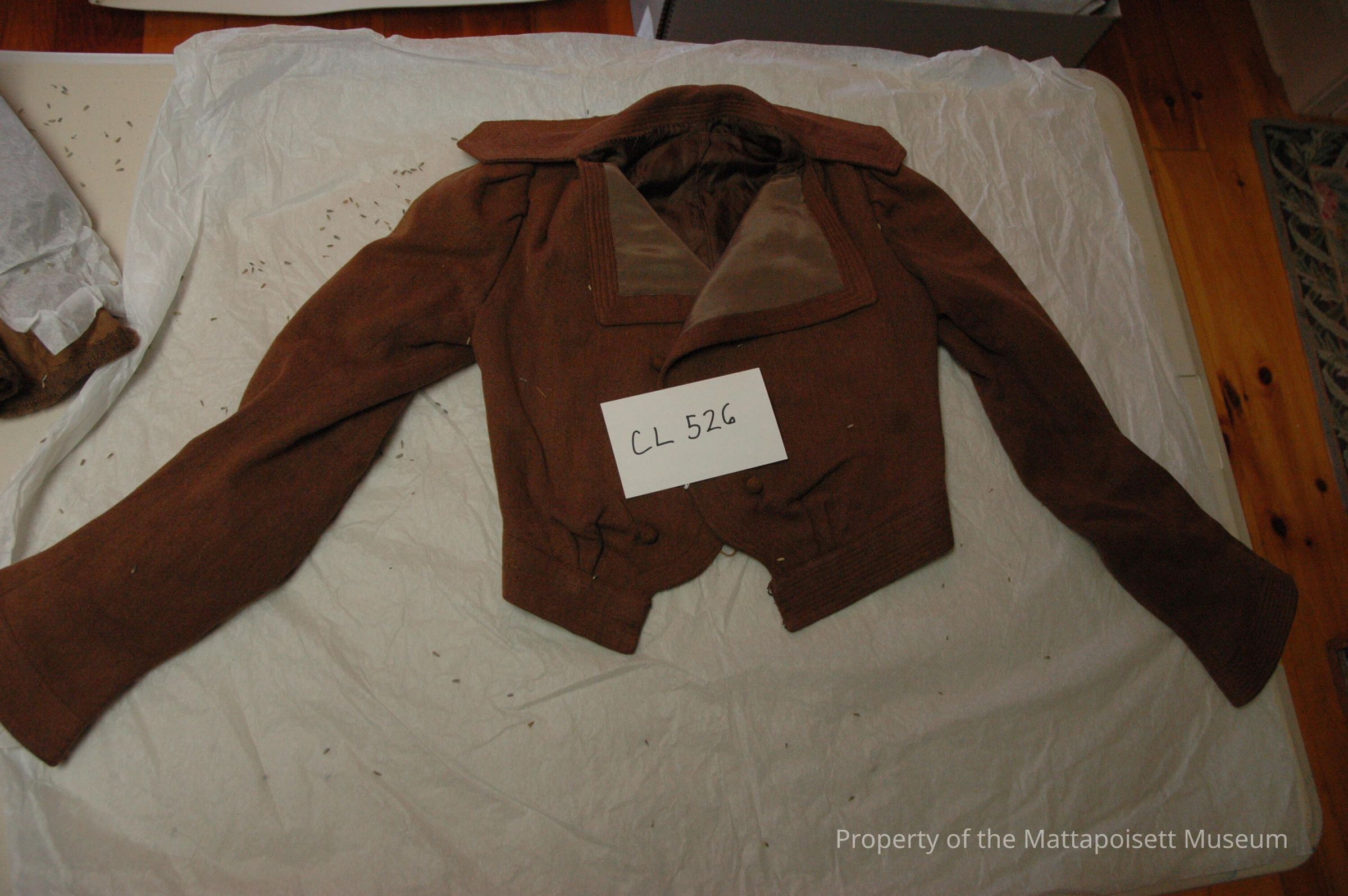 Notes: Notecard: Brown wool dress, two piece, with short jacket lined with silk.Created By