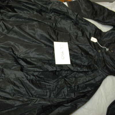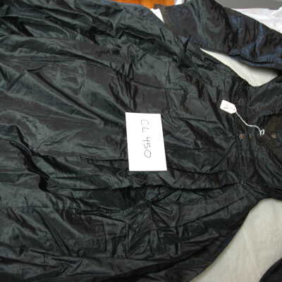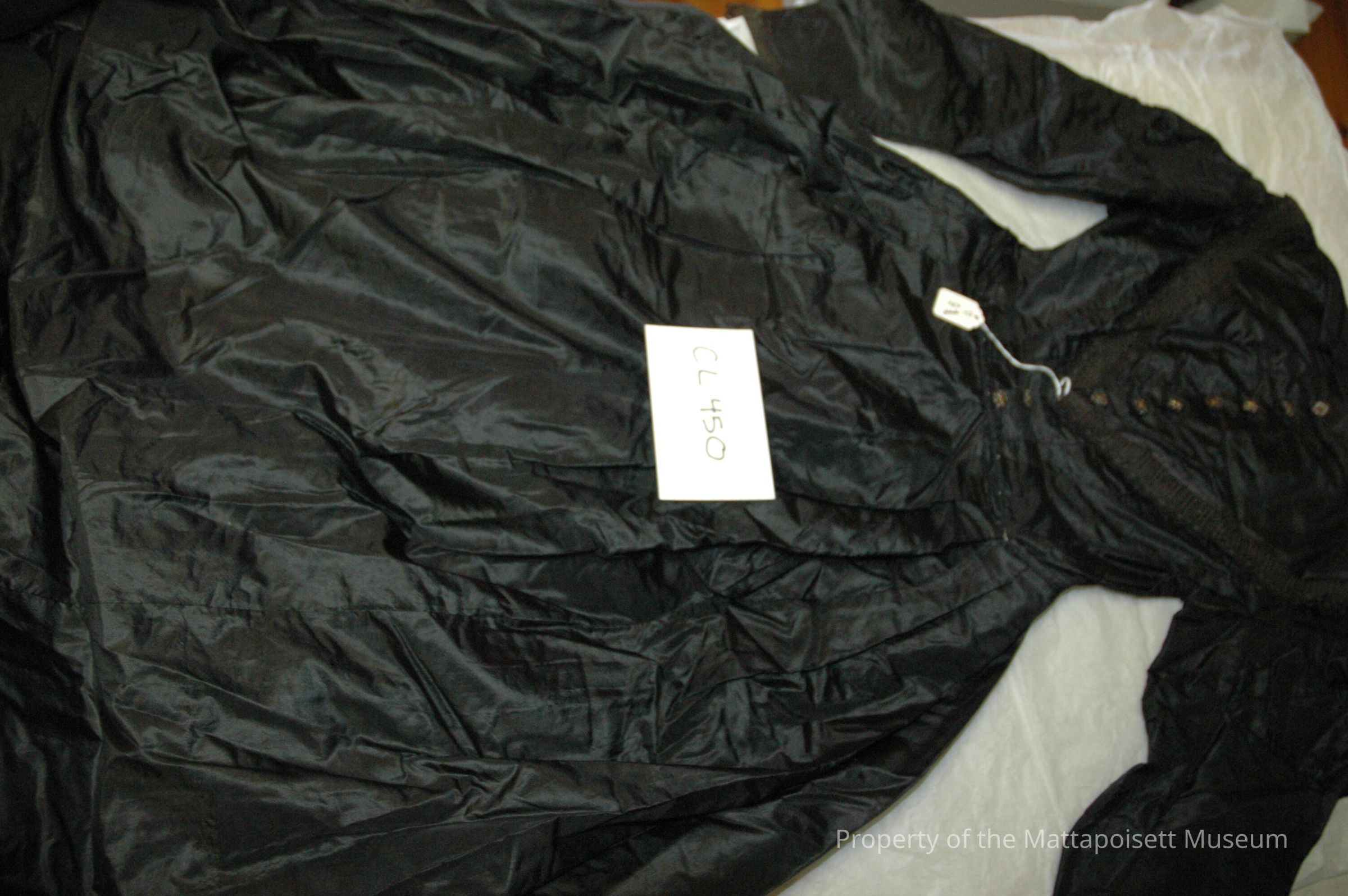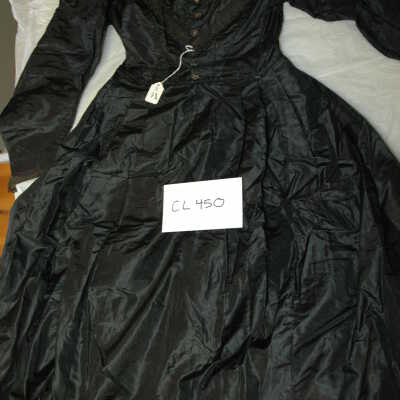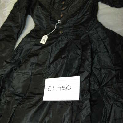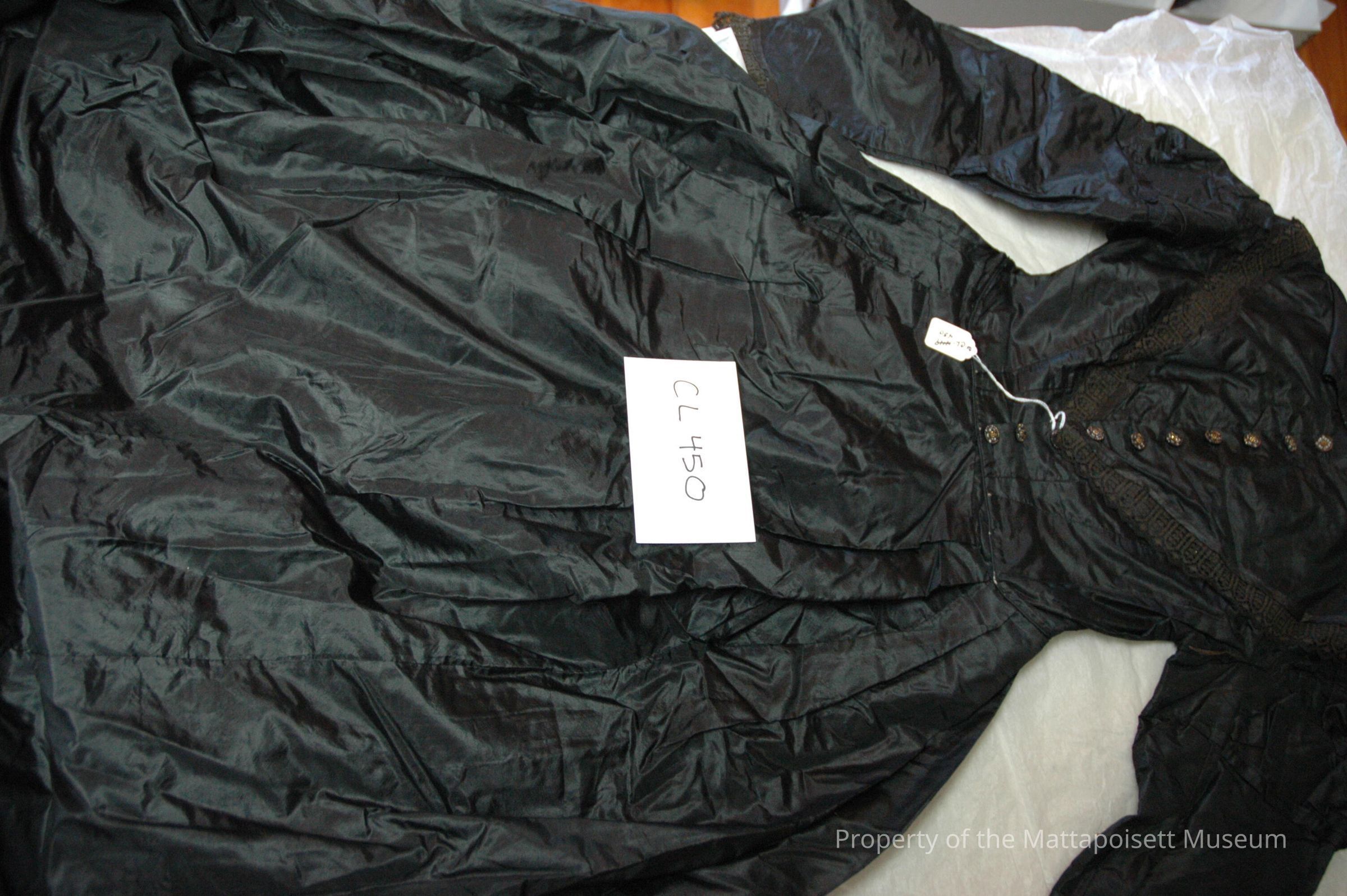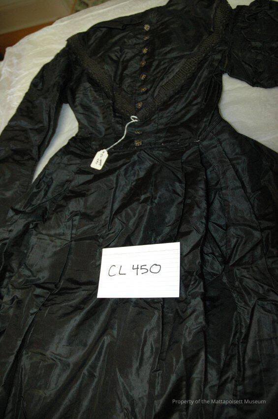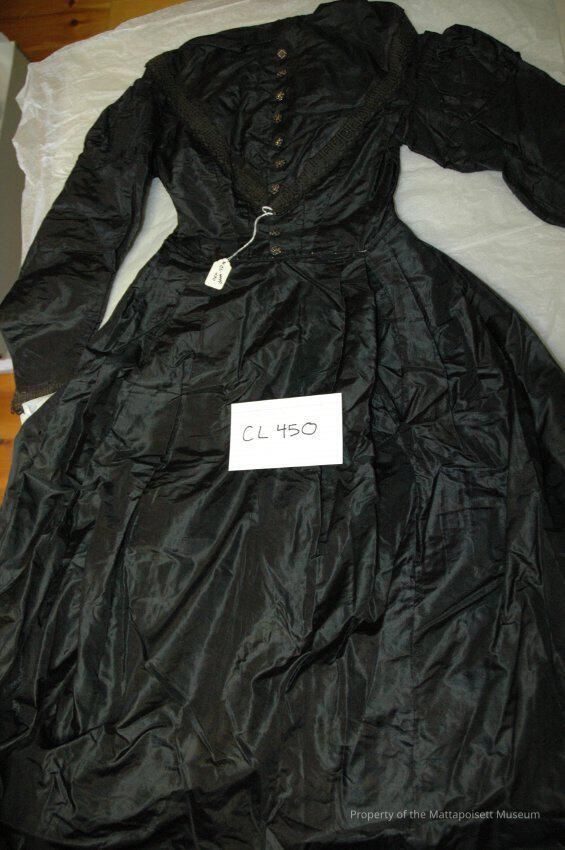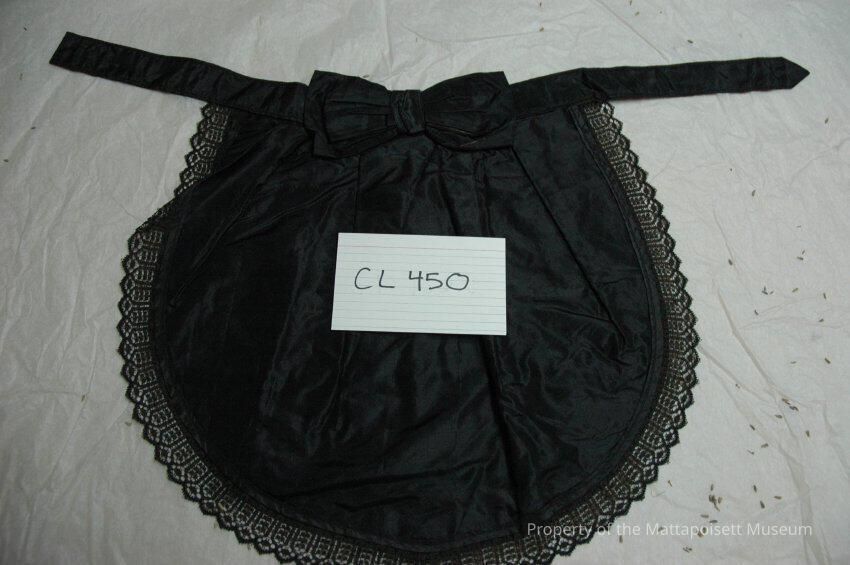 Black silk dress. Black lace trim in V. Bodice and sleeves. Ten small buttons, petal design with crystals. Small apron of same material with bow at waist and some lace trim at hem. Calamanco lining.Collection