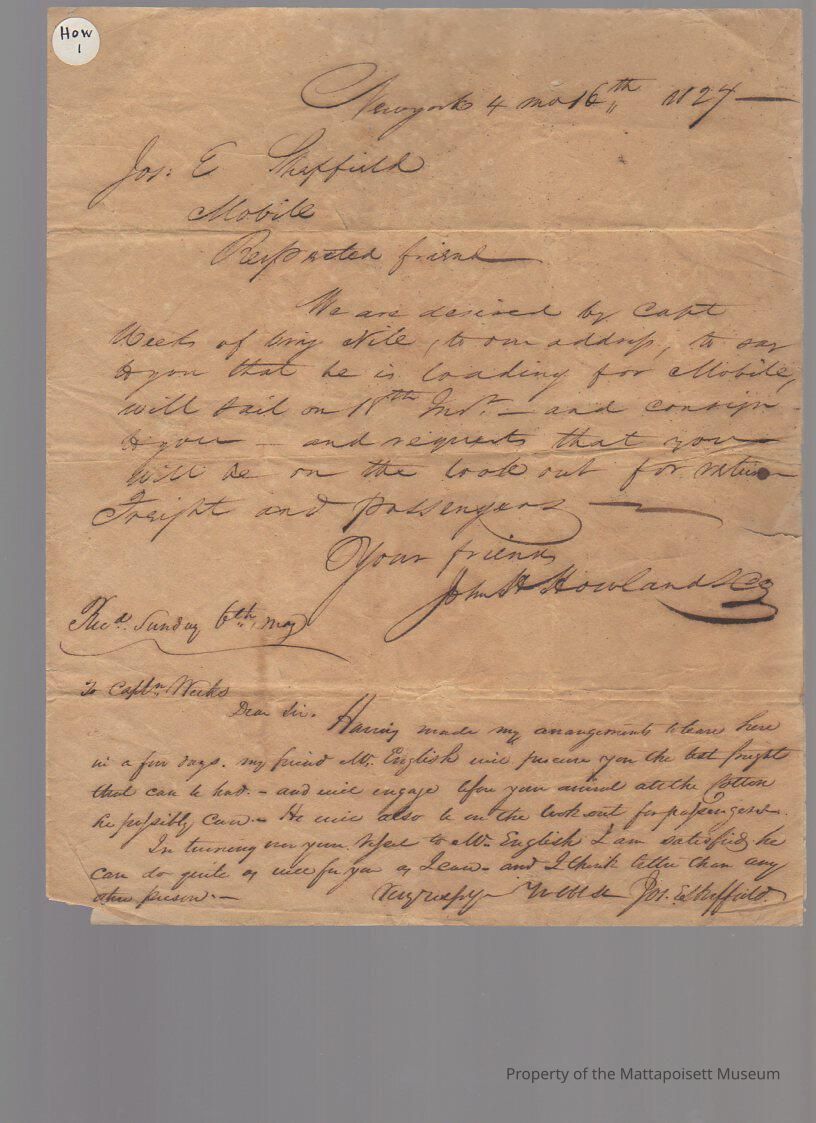 Letter to Joseph E. Sheffield in Mobile from John H. Howland. Response on the same page to Capt. Weeks from Joseph Sheffield.Collection