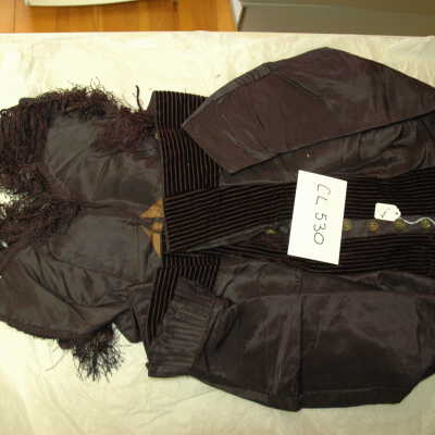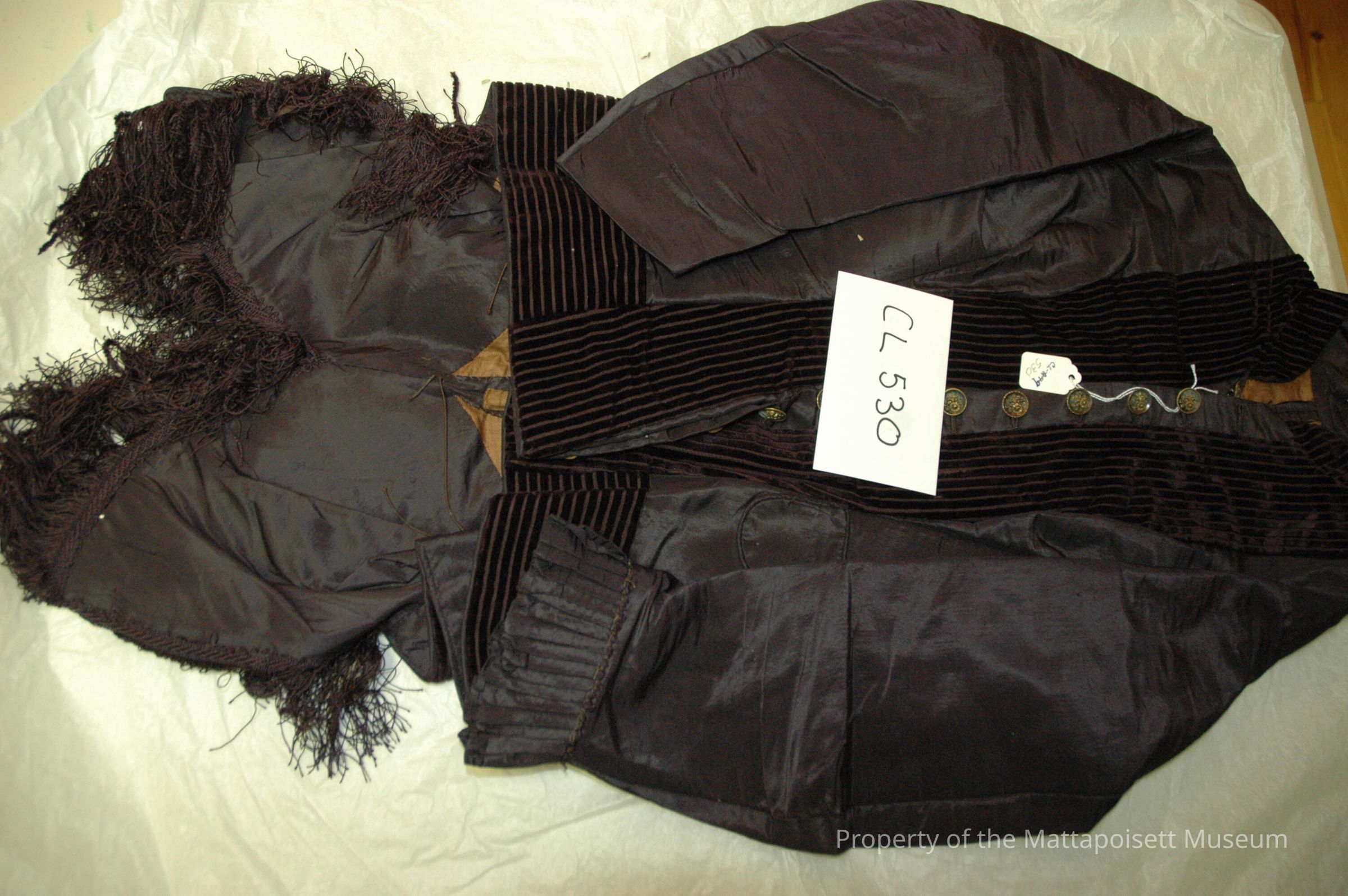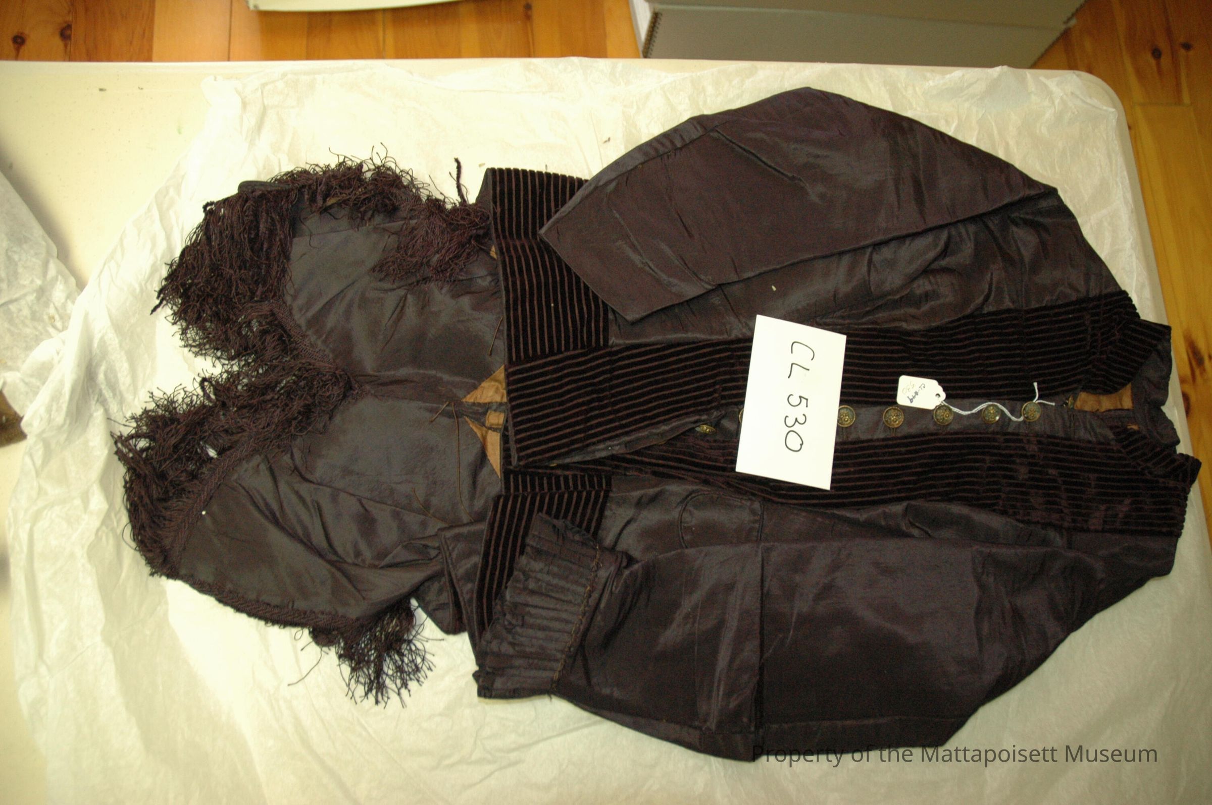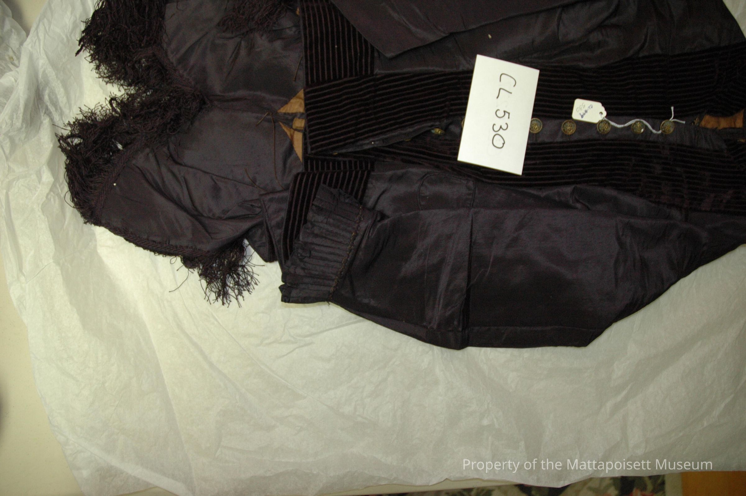 Notes: Notecard: Dark purple jacket with fringe and metal buttons. Peplum.Created By