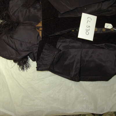 Dark purple jacket. Silk/satin jacket with verticle insets along buttonholes. One cuff is missing peplum, pointed fringed back.Collection