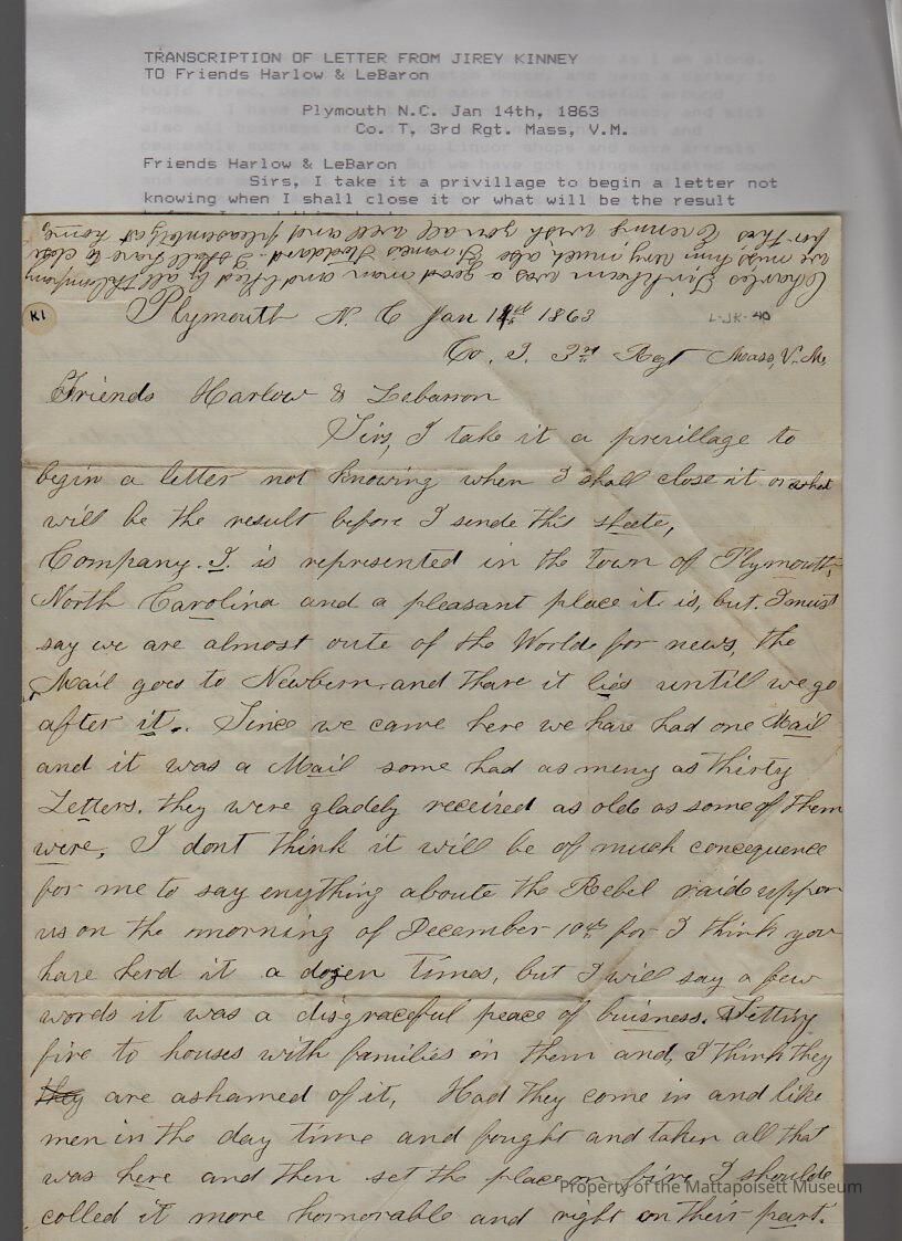 Letter to Harlow & LeBaron from Jirey Kinney in Plymouth, NC.Collection