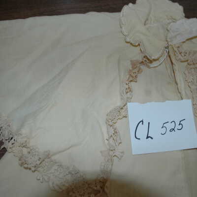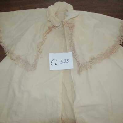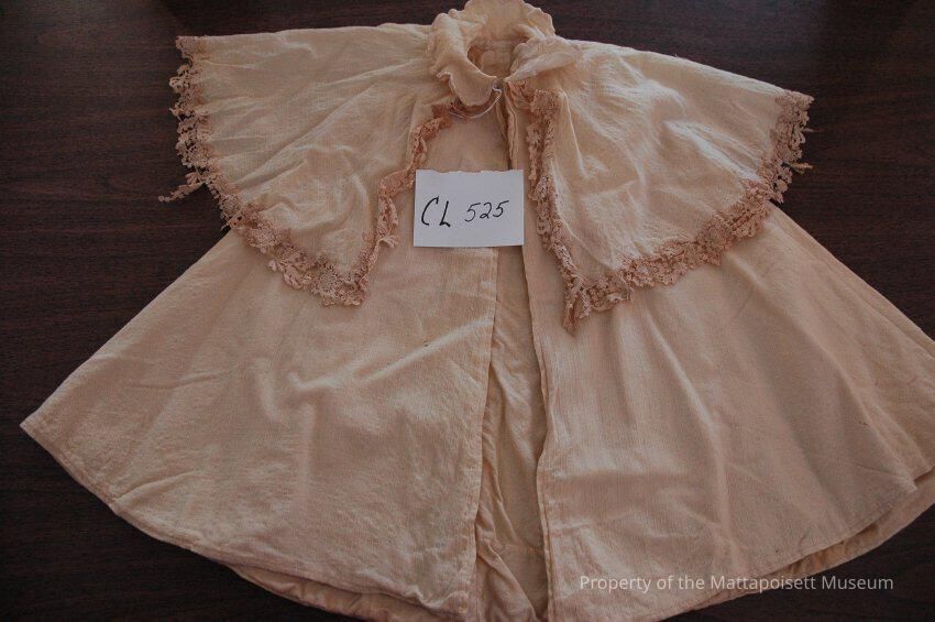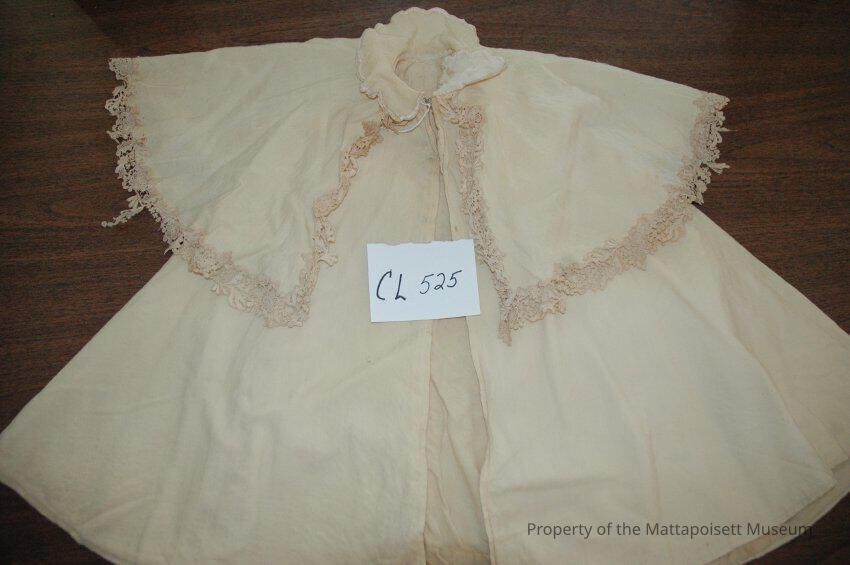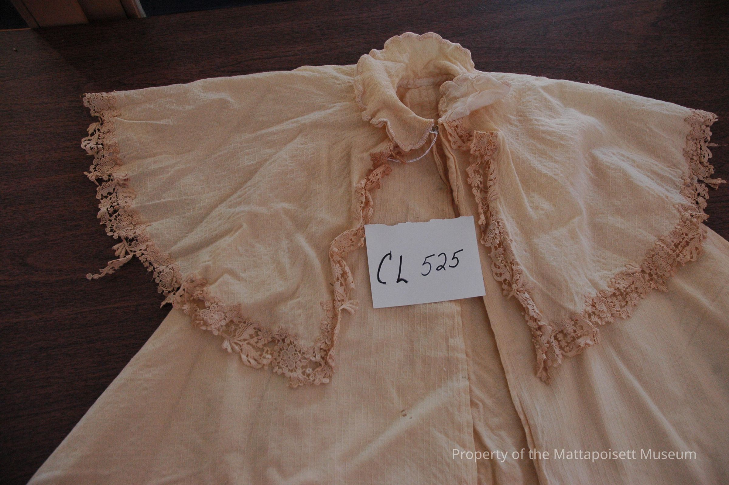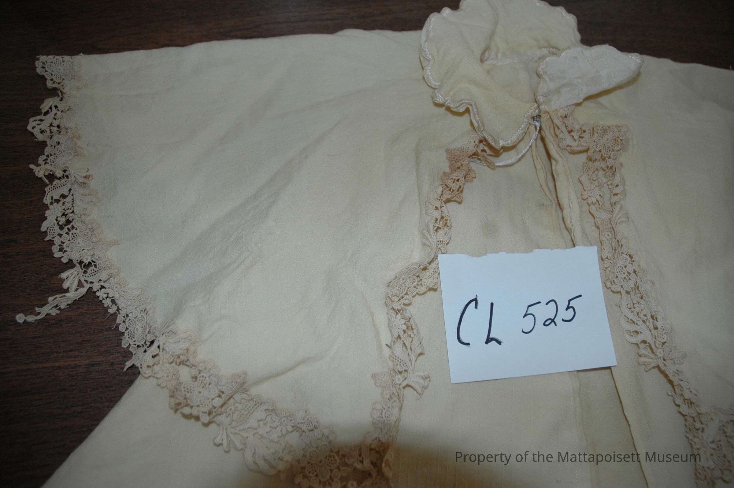 Notes: Notecard: Sleeveless cape-type garment. Sleeveless, lined cream flannel cape-type garmentattached deep collar or shawl with crocheted/lace trim.Created By
