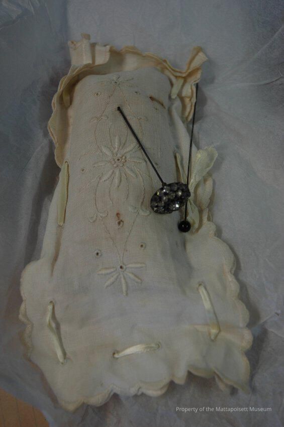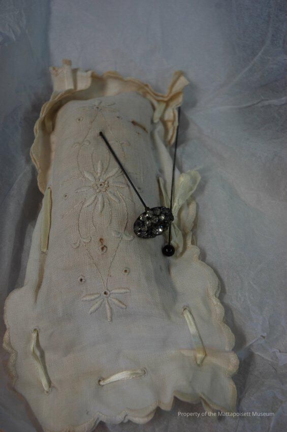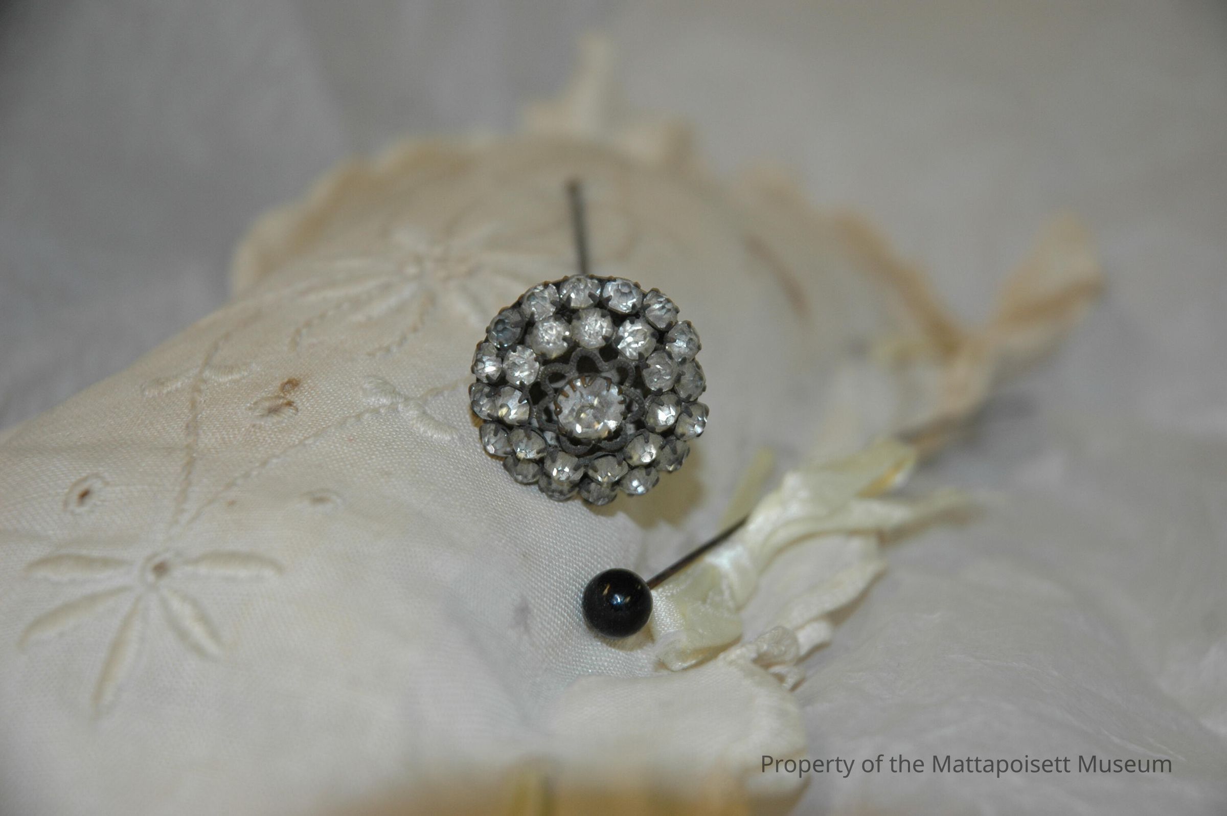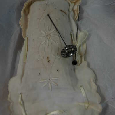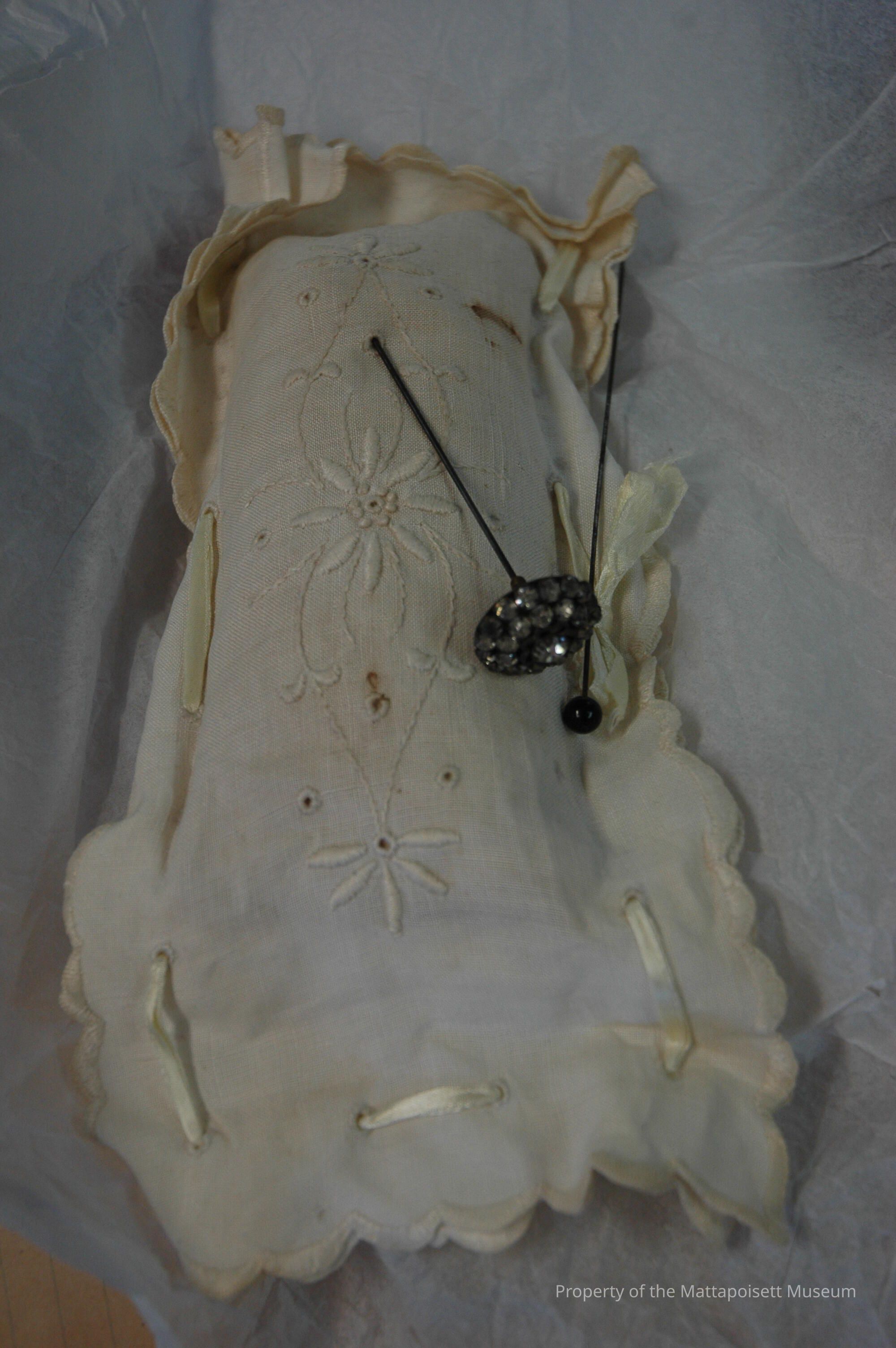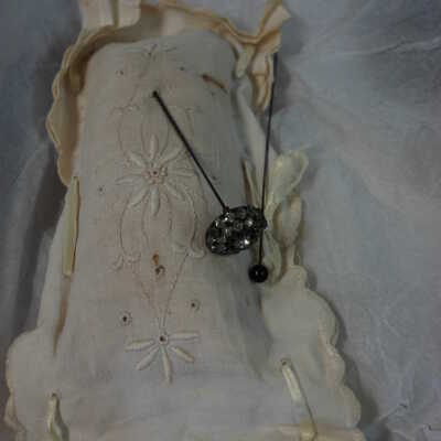 Cotton eyelet pin cushion with two hat pins, one with black sphere on top, one with a clear jeweled flower on topAcquisition