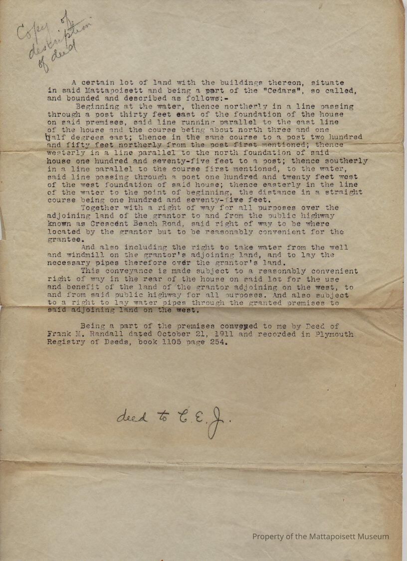Copy of a description of a deed to C. E. J. Part of the premises conveyed by deed of Frank M. Randall, dated October 21, 1911.Collection