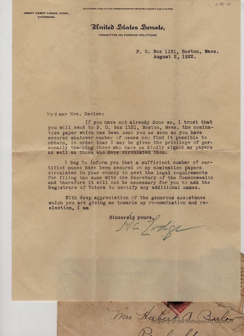 Letter to Mrs. (Herbert A.) Barlow from H. C. Lodge (Henry Cabot), United States Senate Committee on Foreign Relations.Collection