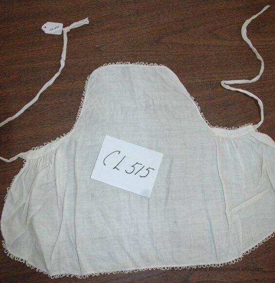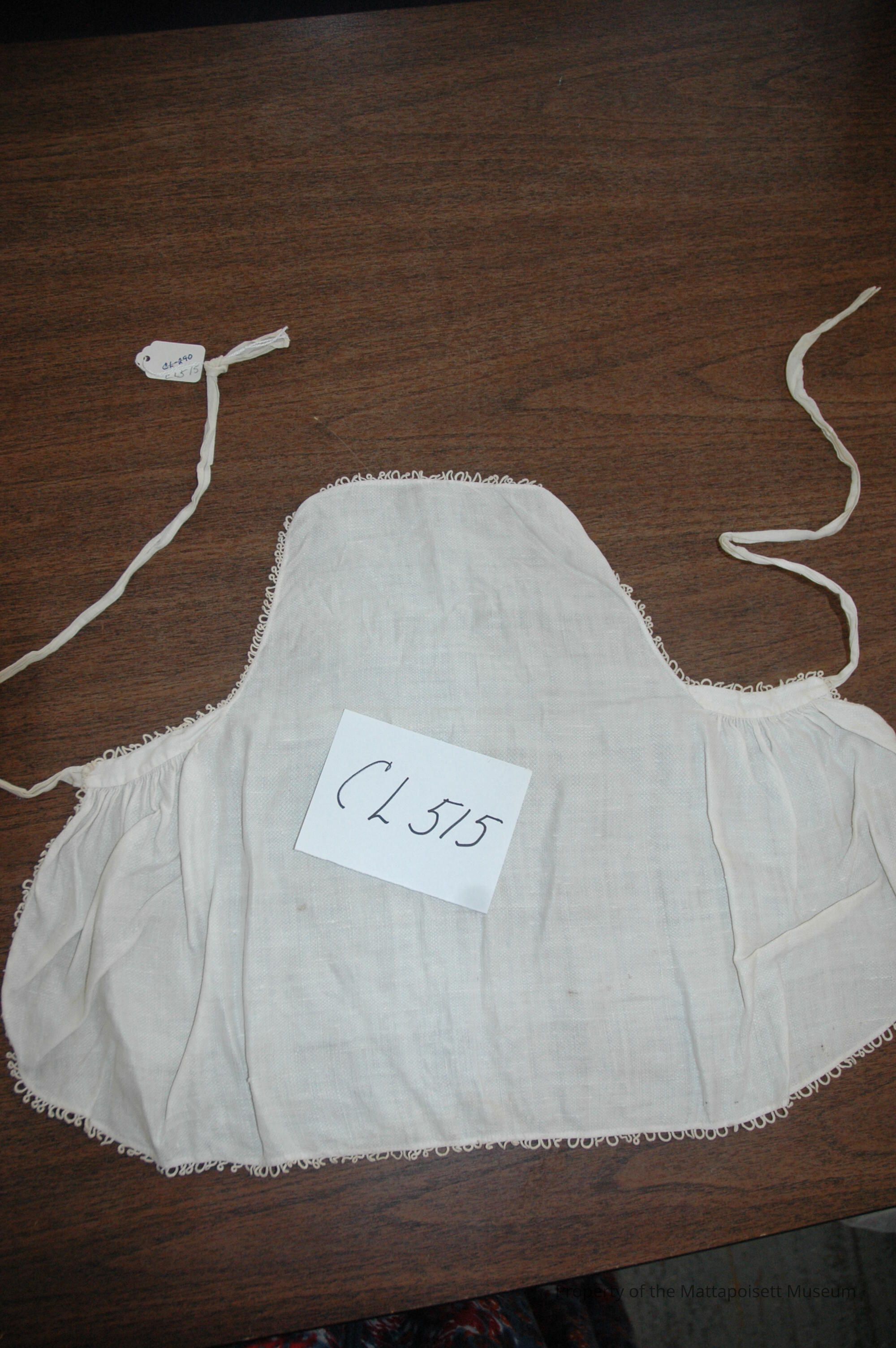 White cotton bib apron (no top ties). Embroidered edge with single rosette loop.Collection