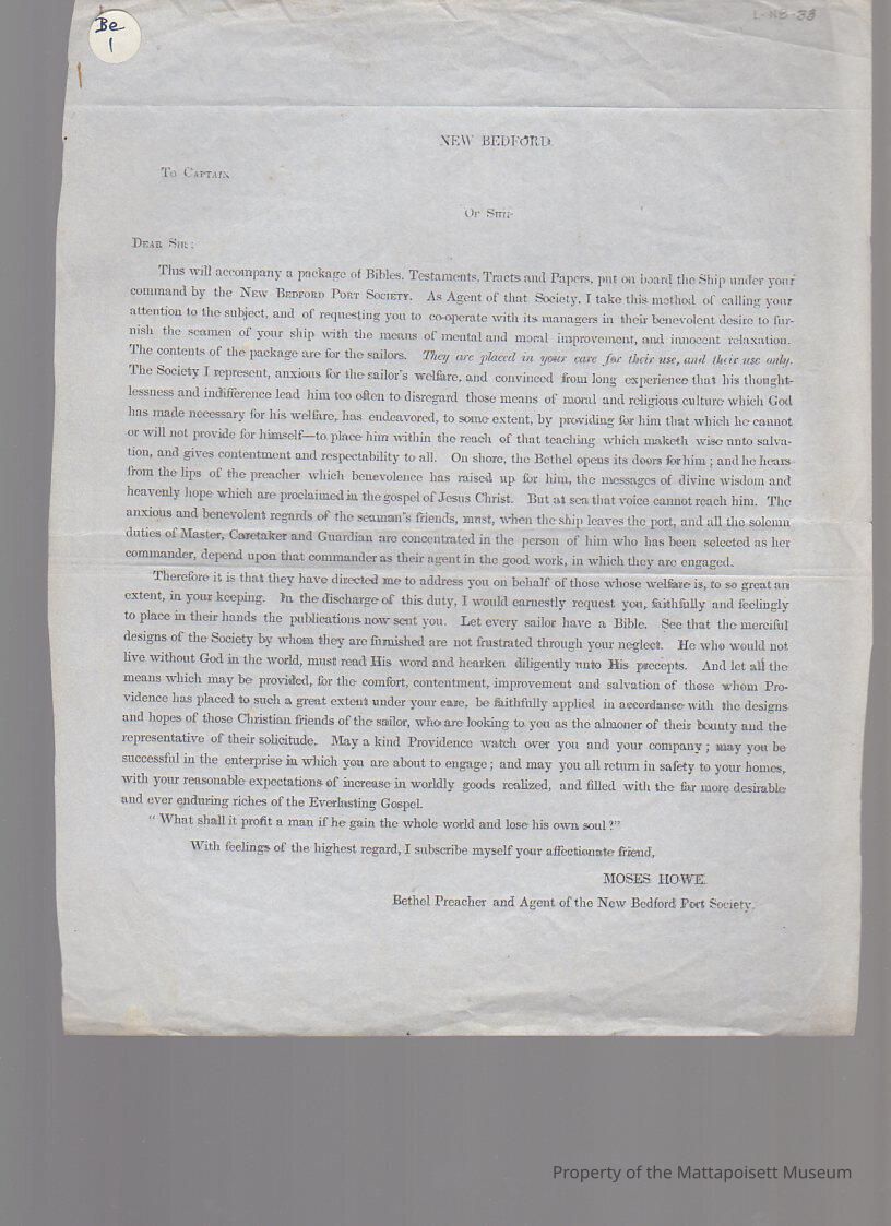 Form letter to Capt. or Ship (blank), accompanying bibles from Moses Howe, Bethel Preacher and Agent of the New Bedford Port Society.Collection