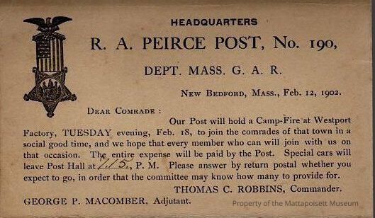 Form Postcard to "Comrade" from Thomas C. Robbins, Commander at R. A. Peirce Post, No. 190. Dept. Mass. G. A. R.Collection