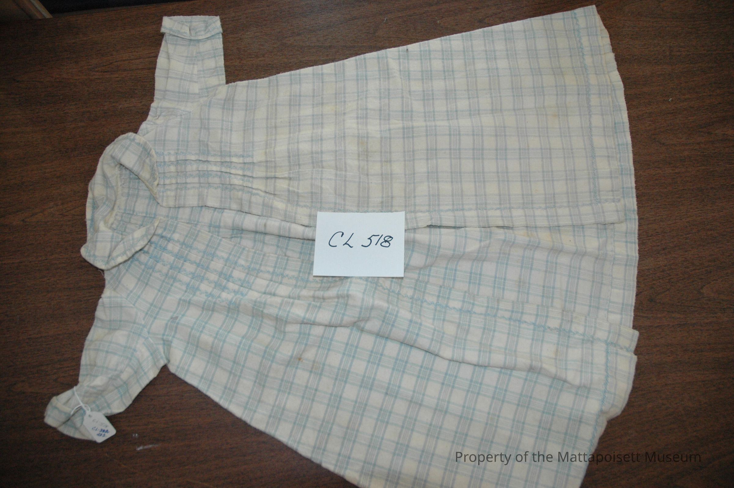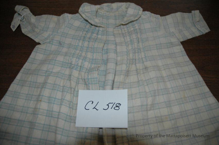 Children's flannel robe. Blue "plaid" on white with blue feather stitching down pleating on the front, along hemline and cuffs. Handmade. Round collar with feather stitch as well as pleats in back.Collection