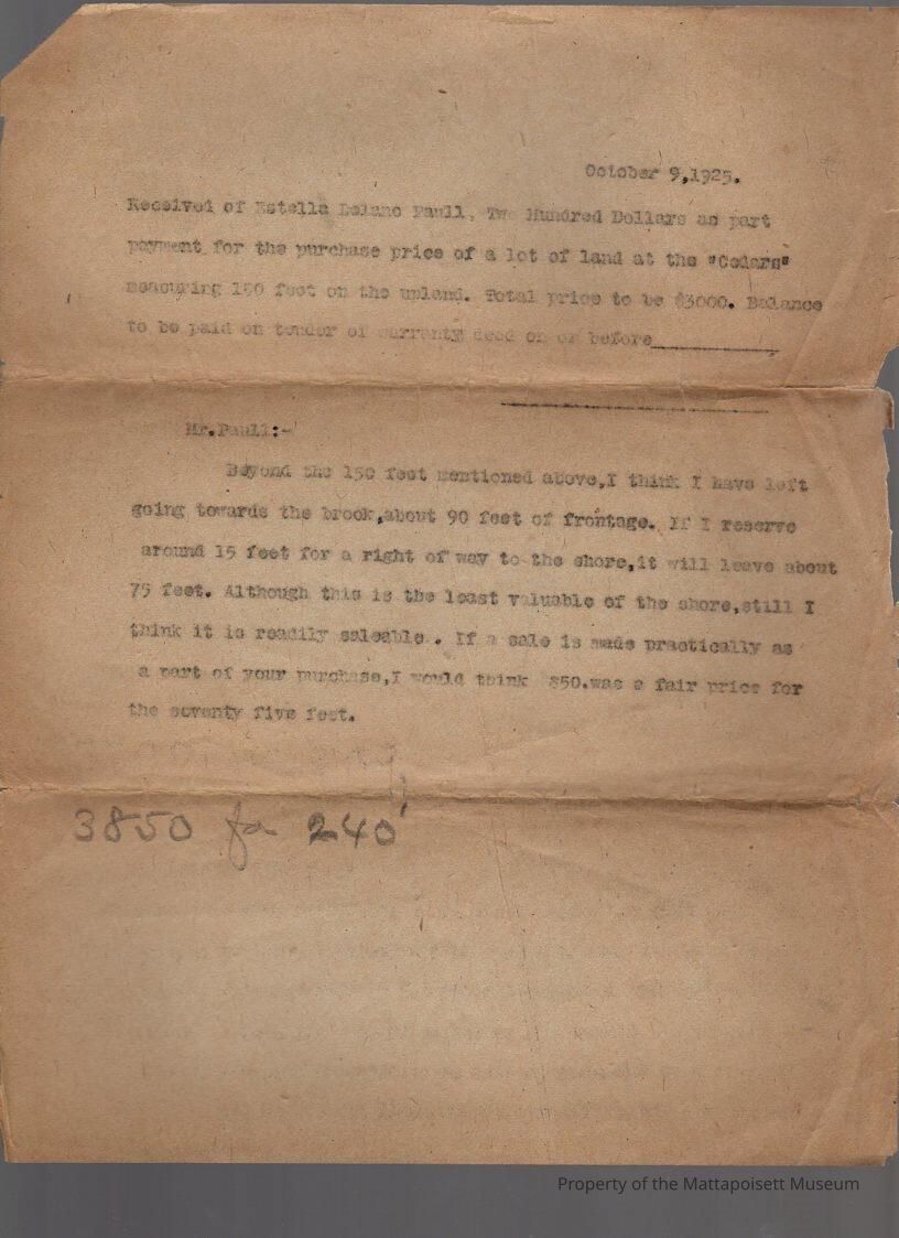 Receipt for partial payment for the purchase price of a lot of land at the "Cedars" from Estella Delano Paull.Collection