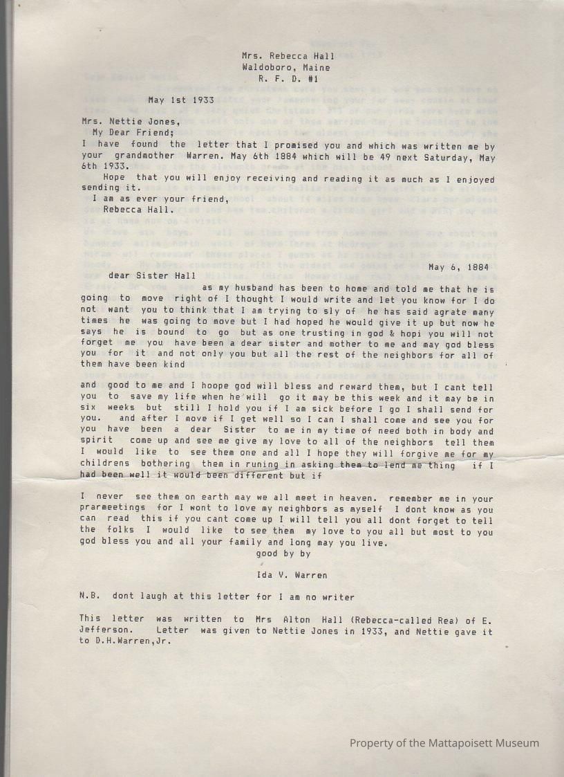 Letter to Mrs. Nettie Jones from Rebecca Hall, sending a letter written by great grandmother (Ida V.) Warren on May 6th 1884.Collection