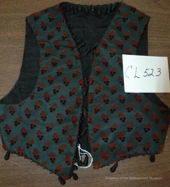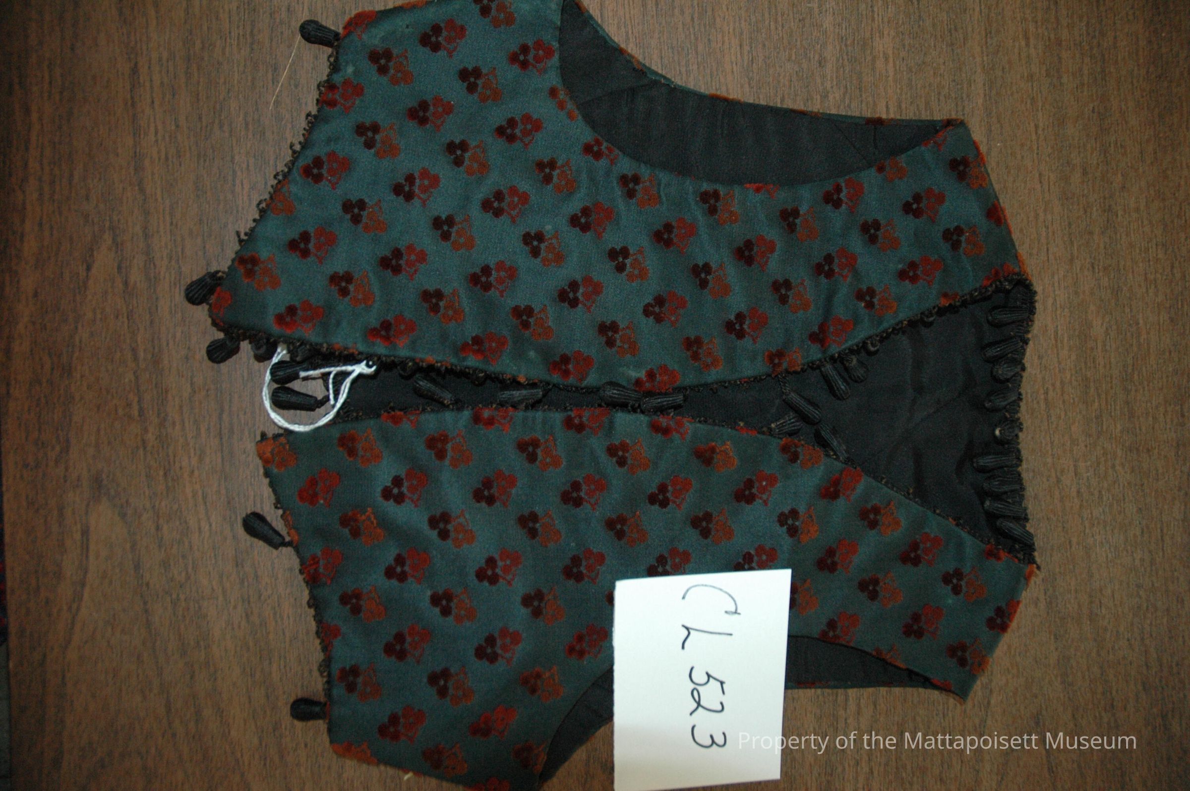 Notes: Notecard: Boy's taffeta vest with black bauble trim. Lined with silk. Dark green silk with velvet flowers.Created By