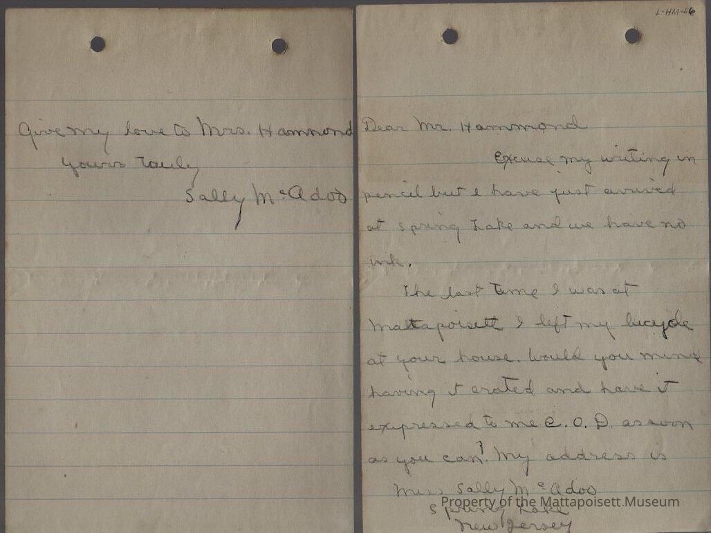 Note to Mr. Hammond from Sally McAdoo, requesting he ship her the bike she left at his house.Collection