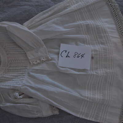 Child's white cotton dress, vertical tucks at neckline. Horizontal tucks at bottom of skirt. Crochet lace trim.Collection