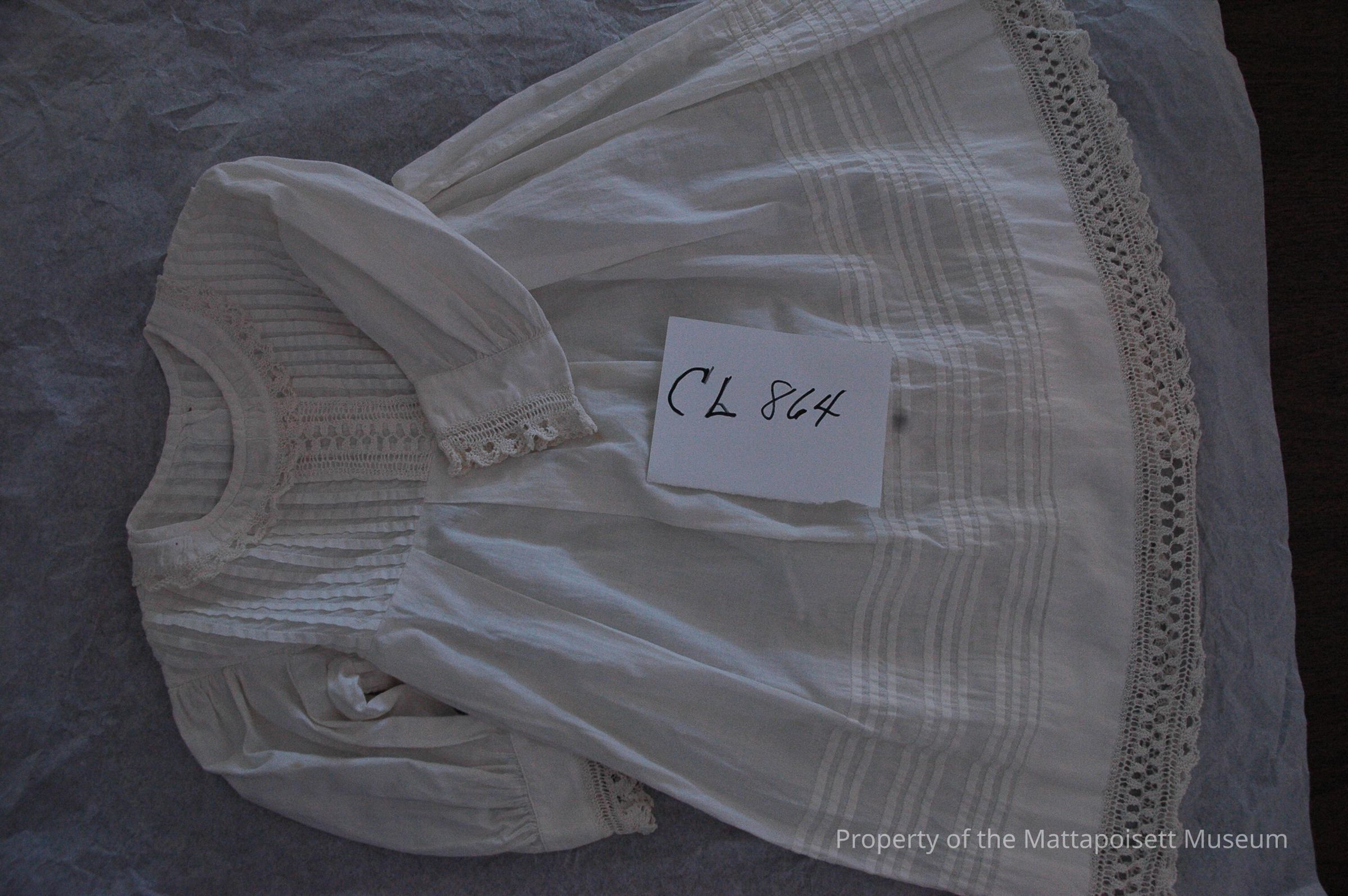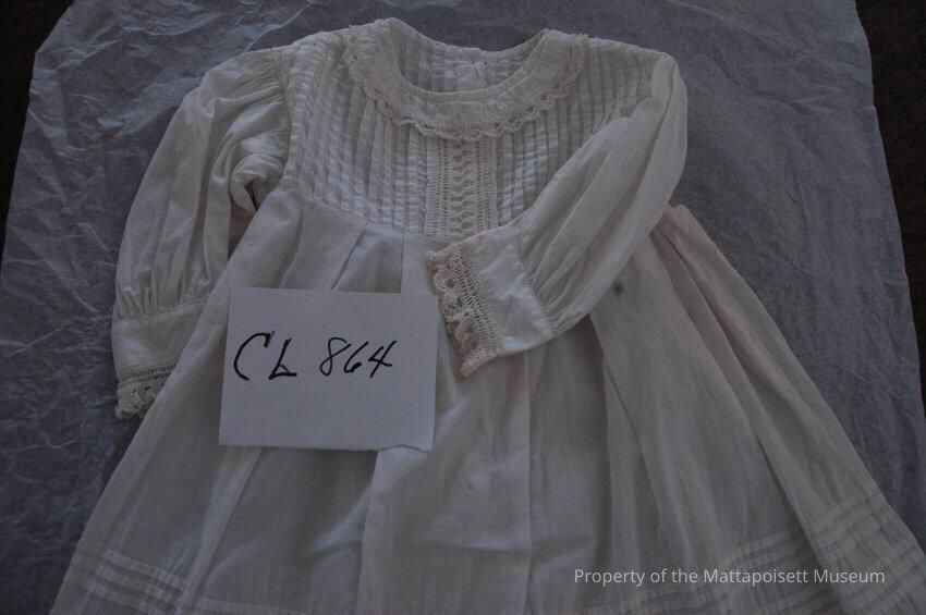 Notes: Notecard: Child's white cotton dress, vertical tucking at bodice. Crochet at neck, sleeves and hem. Horizontal tucking at skirt.