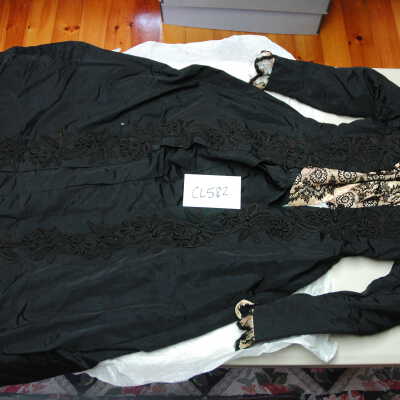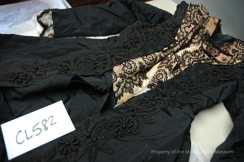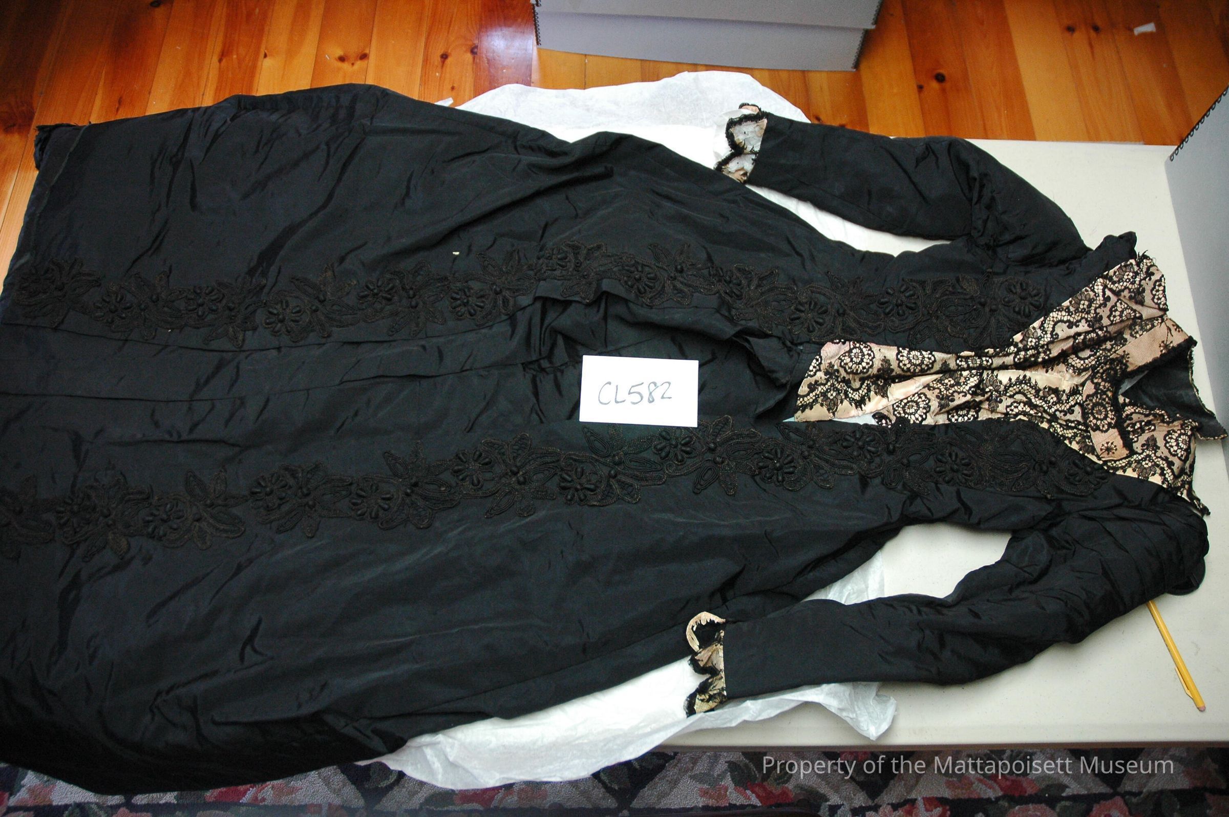 Notes: Notecard: Black gown, calamanco lining. Pink inset at bodice with black lace trim. Heavy braid trim.