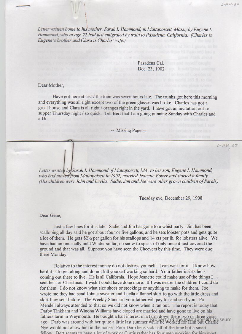 Transcriptions of letters between mother, Sarah I. Hammond and son, Eugene I. Hammond.Collection