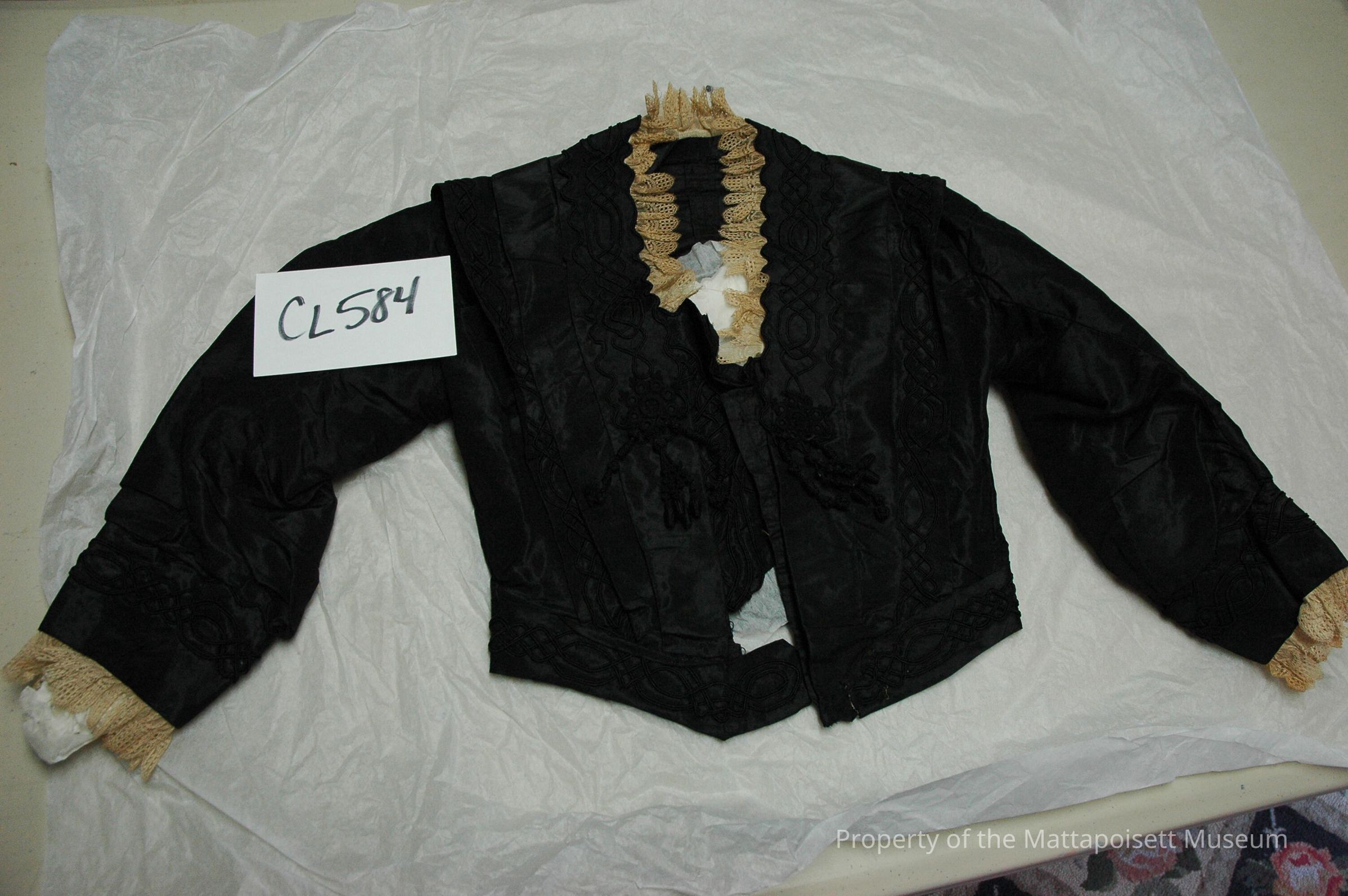 Notes: Notecard: Black waist with white lace trim at neck and waist. Embroidered panel detail. Fancy trim.