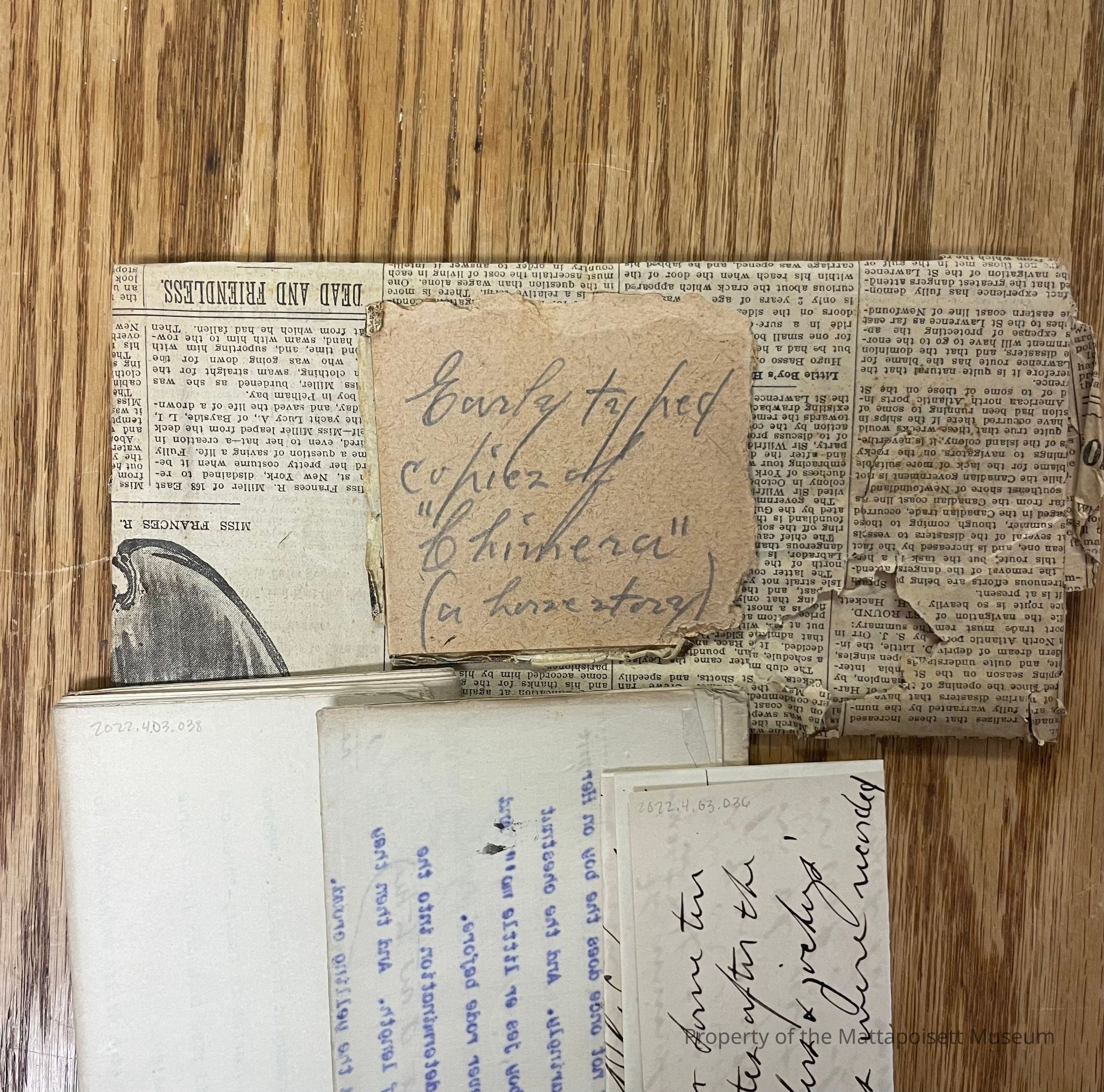 George W. Harrington Collection - Manuscript: A bundle of three manuscripts, two typed and one handwritten. The typed stories have Harrington's handwritten notes in the margin. The bundle was wrapped in newspaper and titled "Early typed copies of 'Chimera' (a horse story)"