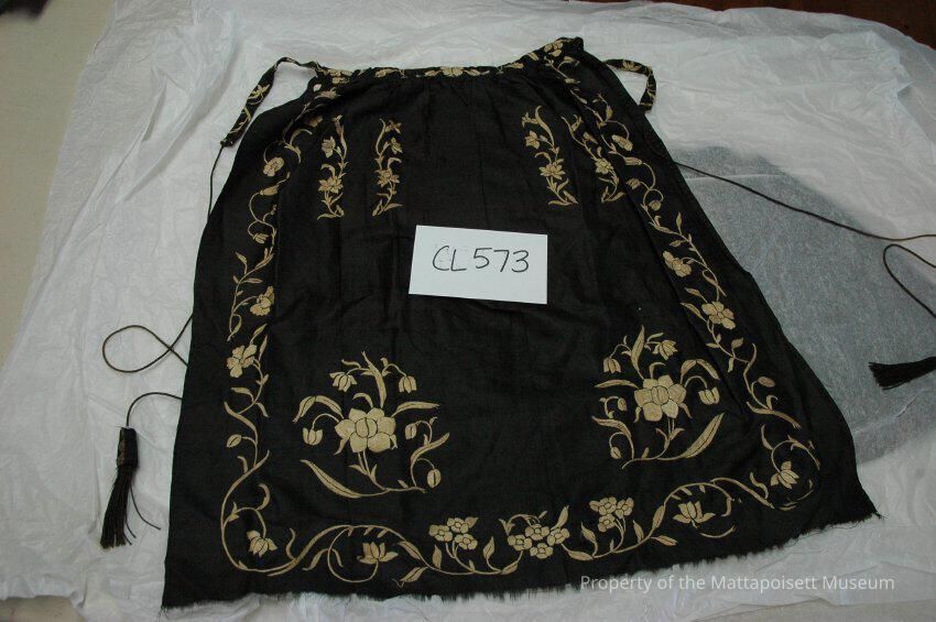 Notes: Notecard: Black silk apron with elaborate beige embroidery. Tassels on the end of the ties.