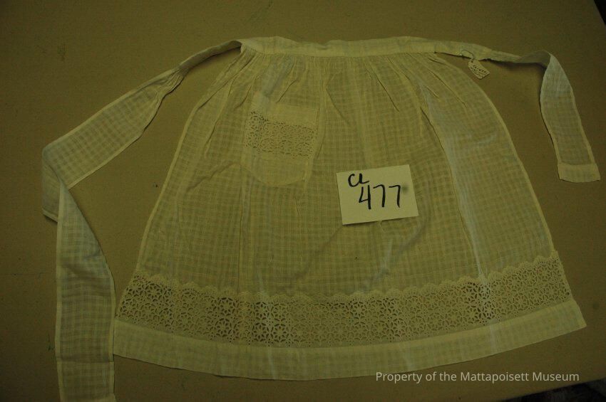 Short white cotton apron. Openwork trim on bottom and pocket. Window pane check white on white.Collection