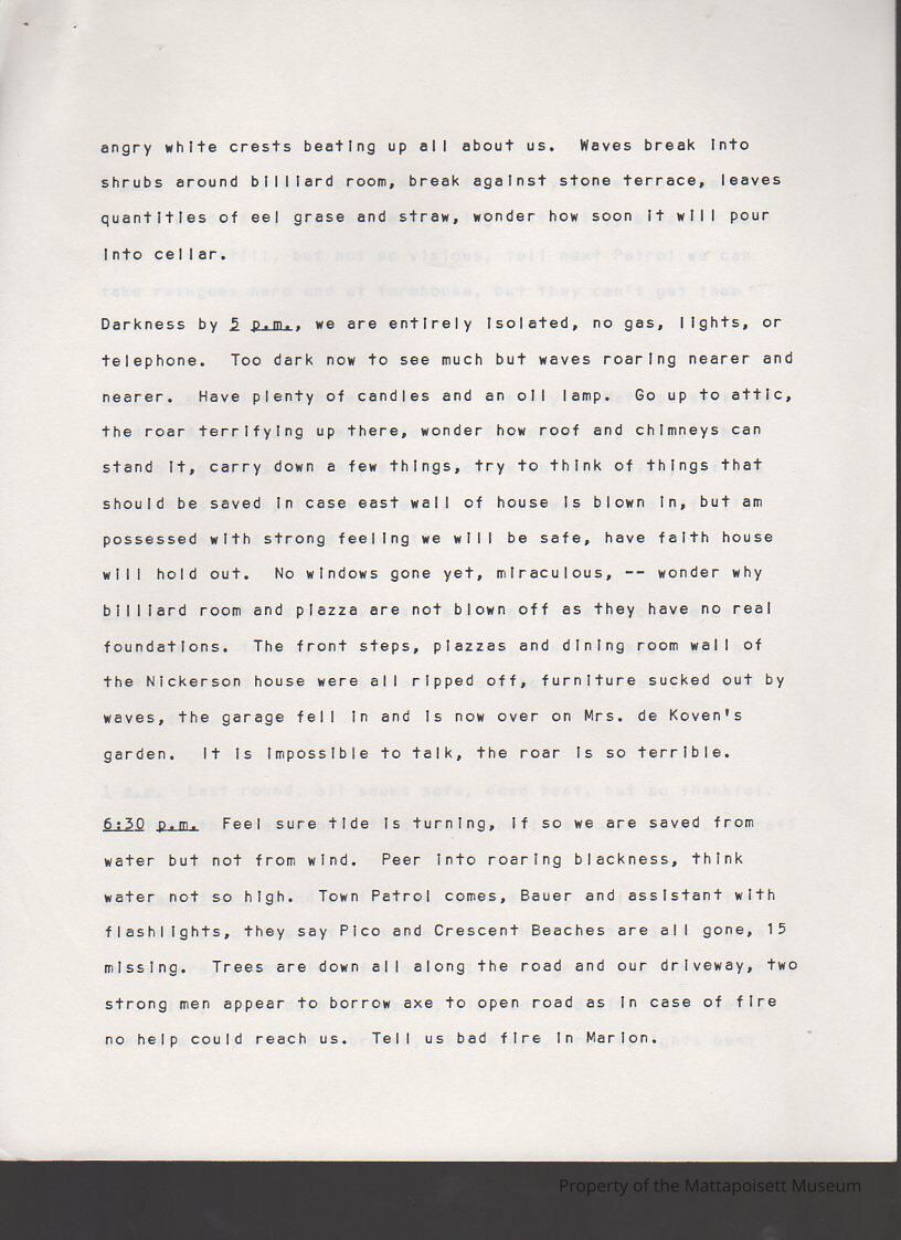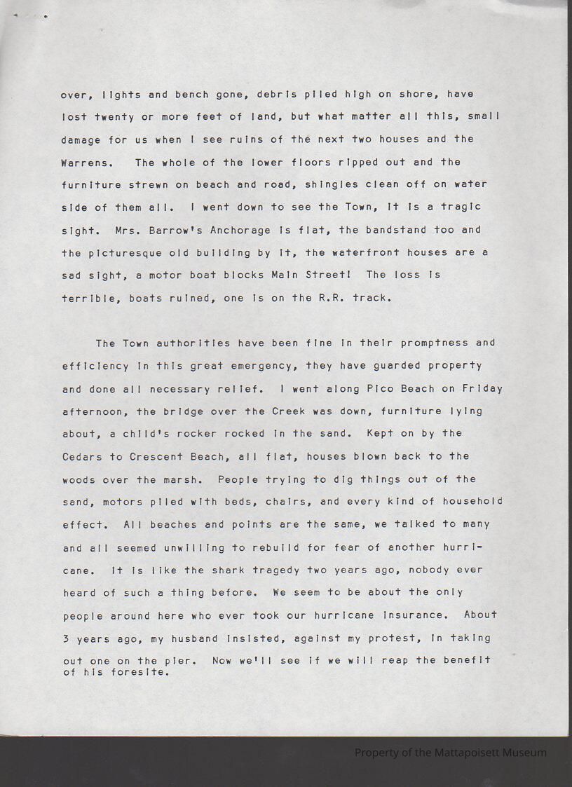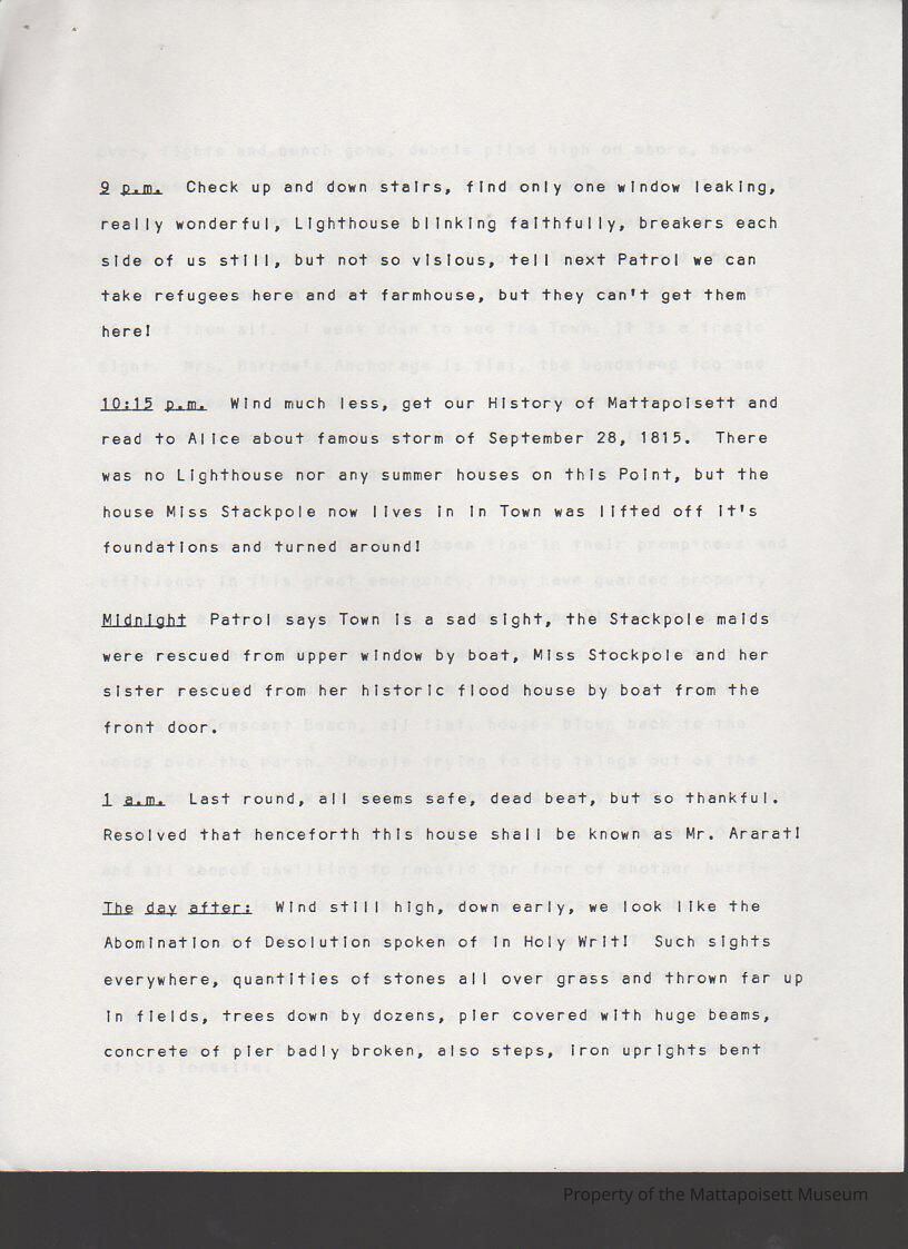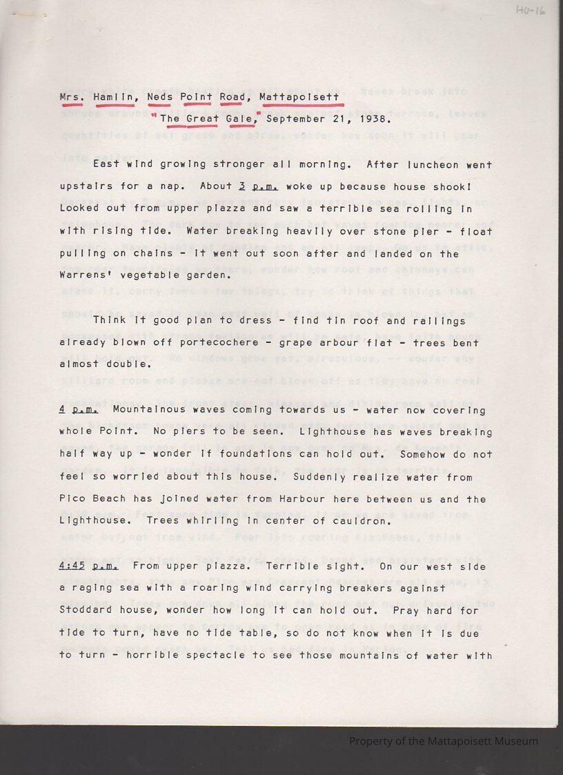 Mrs. Hamlin, Neds Point Road, Mattapoisett. "The Great Gale". Recollections of 1938 Hurricane.Collection